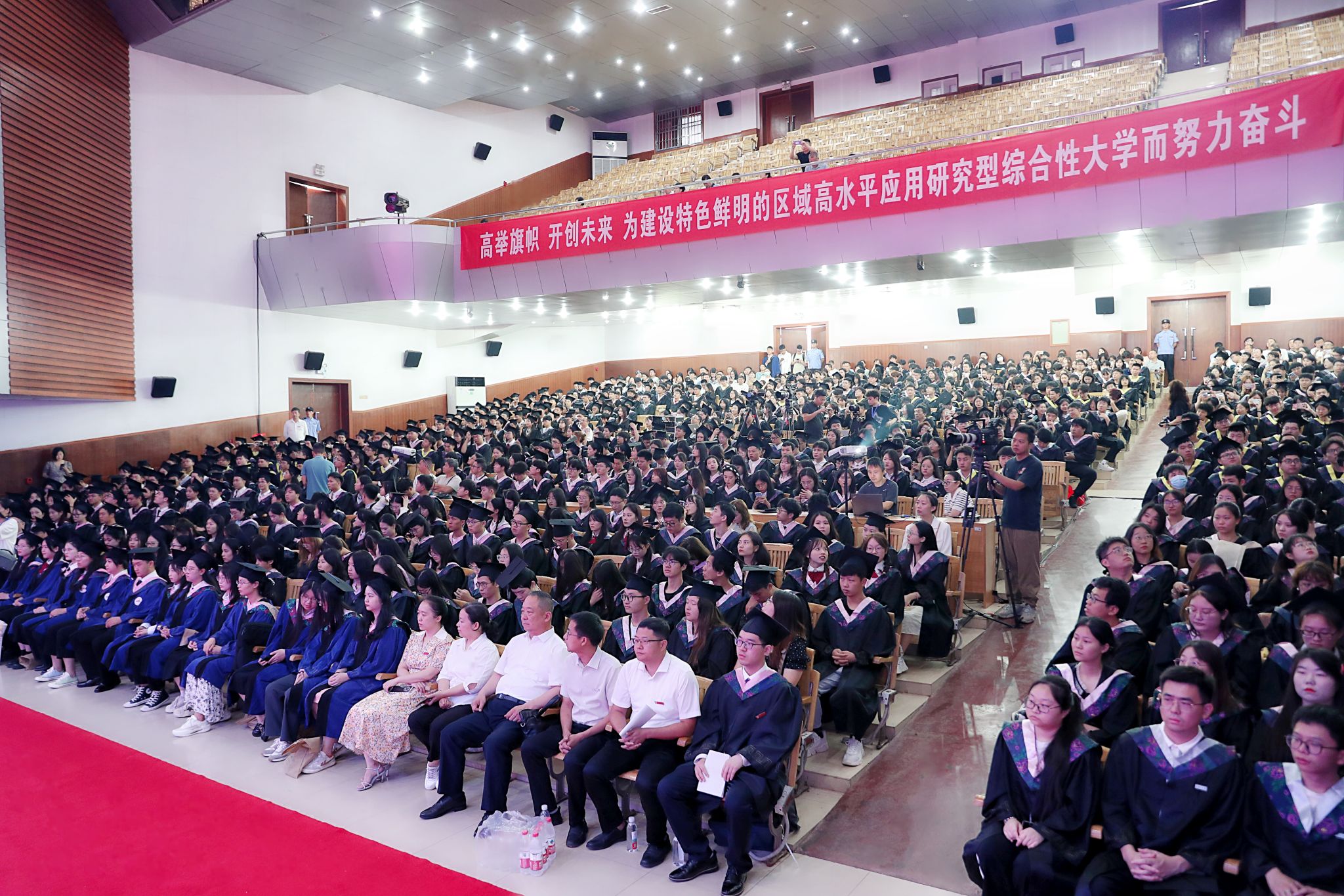 在雄伟的国歌奏响之时,仪式拉开了序幕。校长罗旭彪在典礼上向全体学子殷切寄语。他以“以苦为乐,向苦而行”为题,向2023届全体毕业生提出了以下四点希望:一是希望同学们坚定“以苦为乐”的心态,在“乐于吃苦、敢于吃亏”中磨炼心智。要保持强大的内心,主动走出生活的“舒适区”,在吃苦吃亏中磨炼意志、激发潜能,在凤凰涅槃中浴火重生,让青春在苦难磨砺中绽放绚丽之花。二是希望同学们养成“苦学苦思”的习惯,在“学海无涯、三思后行”中沉淀人生。谨记“广学坚守,勤思敏行”的校训,勤于学习、善于思考,坚持“学思用贯通,知信行合一”,争当科技难题的挑战者和求解者,把论文写在祖国大地上,写在人民对美好生活的向往中。三是希望同学们保持“苦干实干”的作风,在“艰苦奋斗、求真务实”中建功立业。要把真才实学运用到实际生产和生活当中,俯下身子挑重担,卷起袖子加油干,发扬埋头苦干、任劳任怨的实干精神,用青春热血书写无愧于时代的精彩华章。四是希望同学们坚信“苦尽甘来”的道理,在“久久为功,天道酬勤”中实现梦想。不忘党的恩情和国家的栽培,努力涵养“吃苦”的精神,保持“吃苦”的韧劲,“苦学”理论知识,“苦思”时代课题,“苦干”复兴伟业,以奋发有为的姿态走好新时代赶考之路,为实现中华民族第二个百年奋斗目标贡献青春力量。