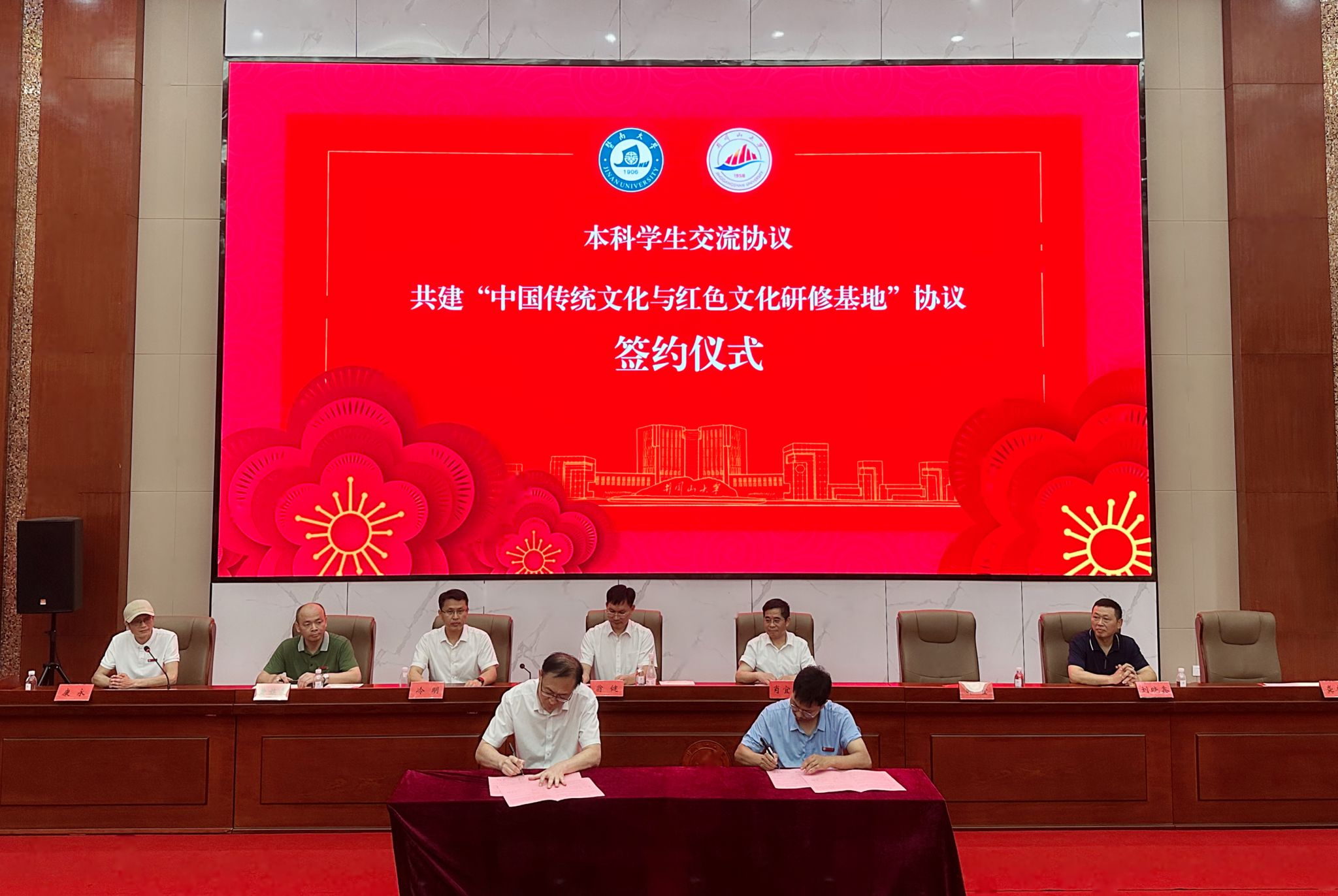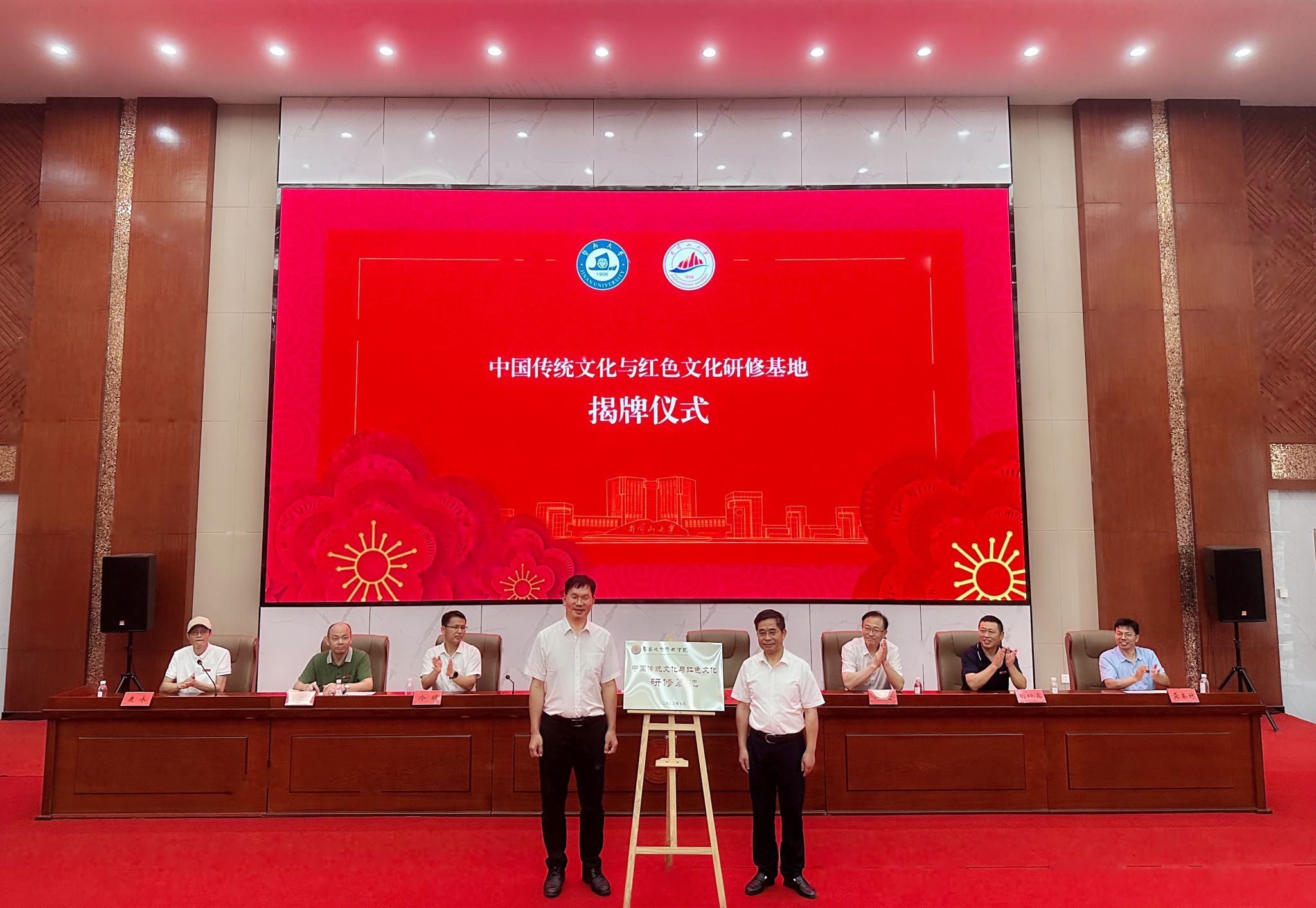 在与会人员的见证下,双方签订本科学生交流协议、共建“中国传统文化与红色文化研修基地”协议,翁健和肖宜安为暨南大学华文学院在人文学院设立的“中国传统文化与红色文化研修基地”揭牌。