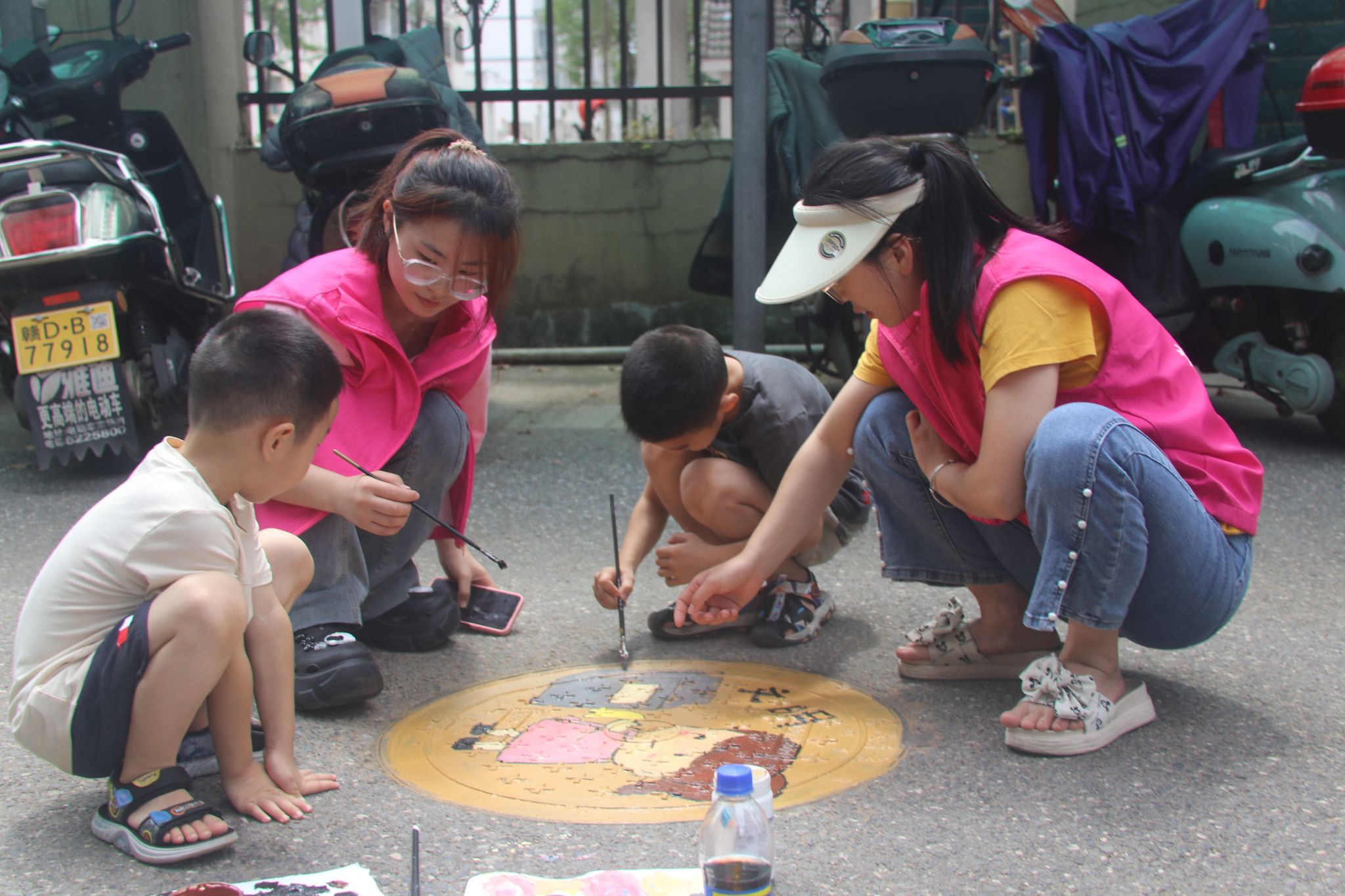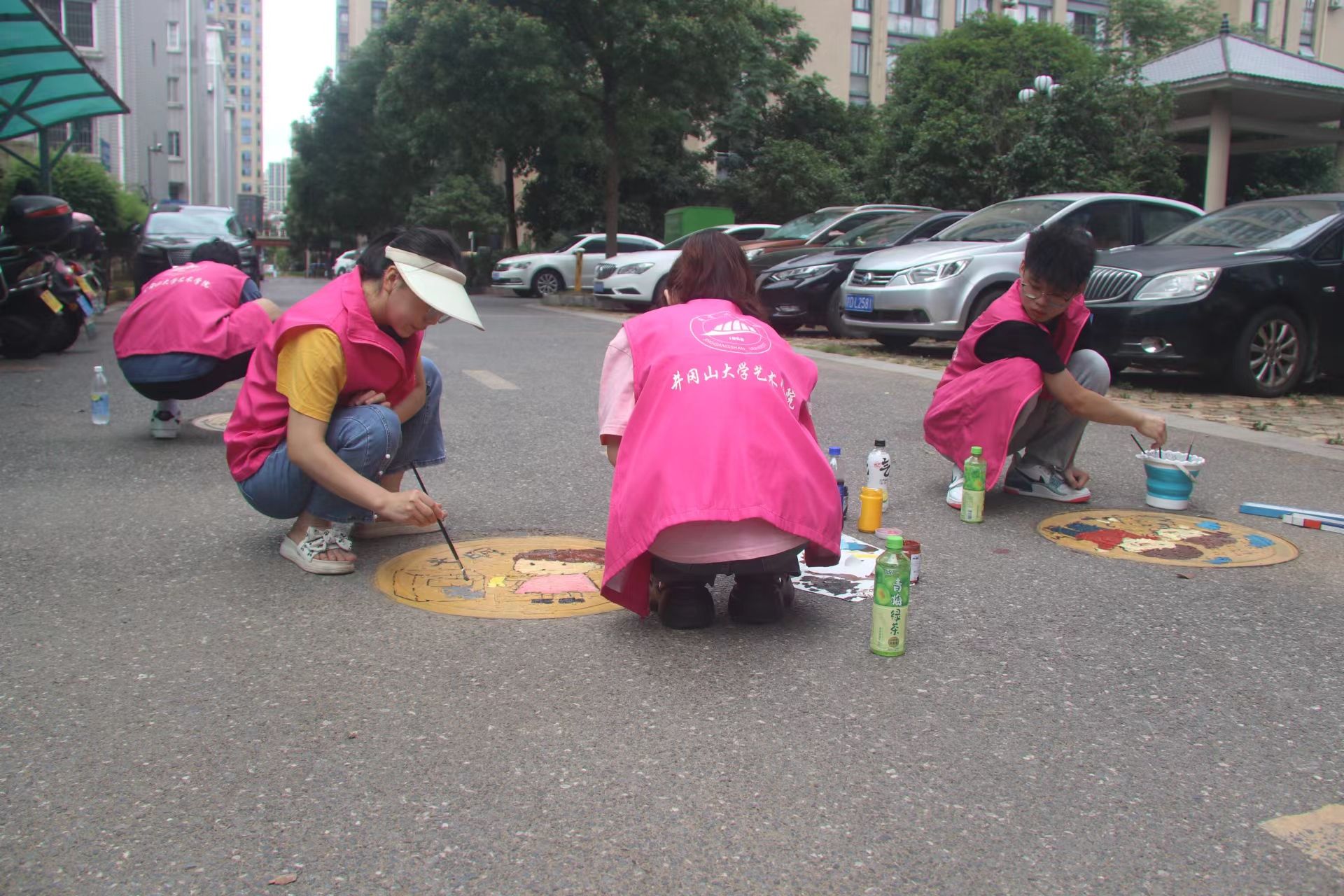 艺术学院“艺心礼赞二十大,赋能基层展芳华”社区文明实践团赴天和社区开展“移风易俗,井上添画”社区文明实践活动,让原本平平无奇的井盖焕然一新、变得鲜活起来,成为社区夏日里的新“井”色,为社区增添了一张张美丽的风景画。
