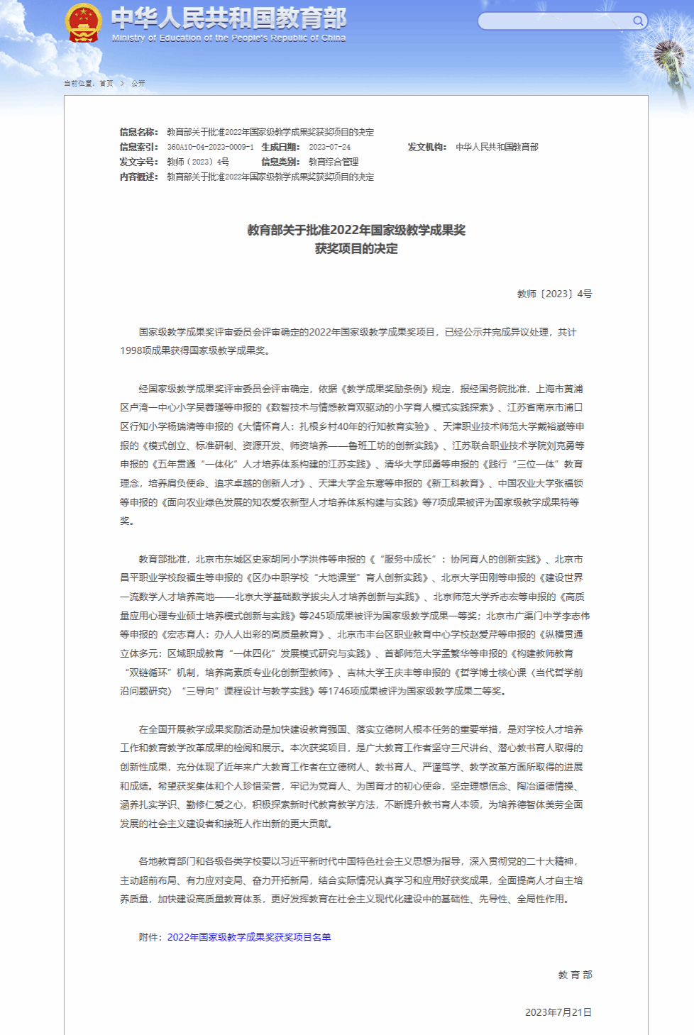 据悉,国家级教学成果奖是与国家自然科学奖、国家技术发明奖、国家科技进步奖、国家教材奖并列的国家级奖项,是目前我国教育领域的最高奖励,该奖每4年评选一次。自1989年举办首届高等教育国家级教学成果奖评选活动以来,已评选九届。2022年全国共评选出高等教育(本科类)国家级教学成果奖获奖项目共572项,特等奖2项、一等奖70项、二等奖500项。(图文:肖发生;审核:黄族豪、肖发生)