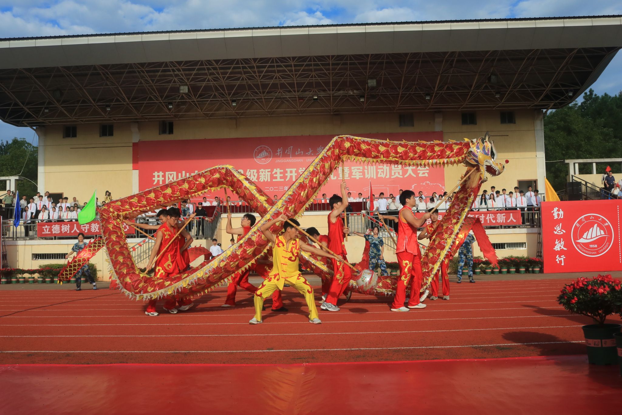为了让学生感受校园文化,熏染革命精神,开学典礼仪式开始前,现场进行了暖场表演。体育学院学生用舞龙表演展现中国青年勇立潮头的风采;艺术学院同学用舞蹈表演《我心中的红》倾诉青年学子砥砺奋斗的时代担当。