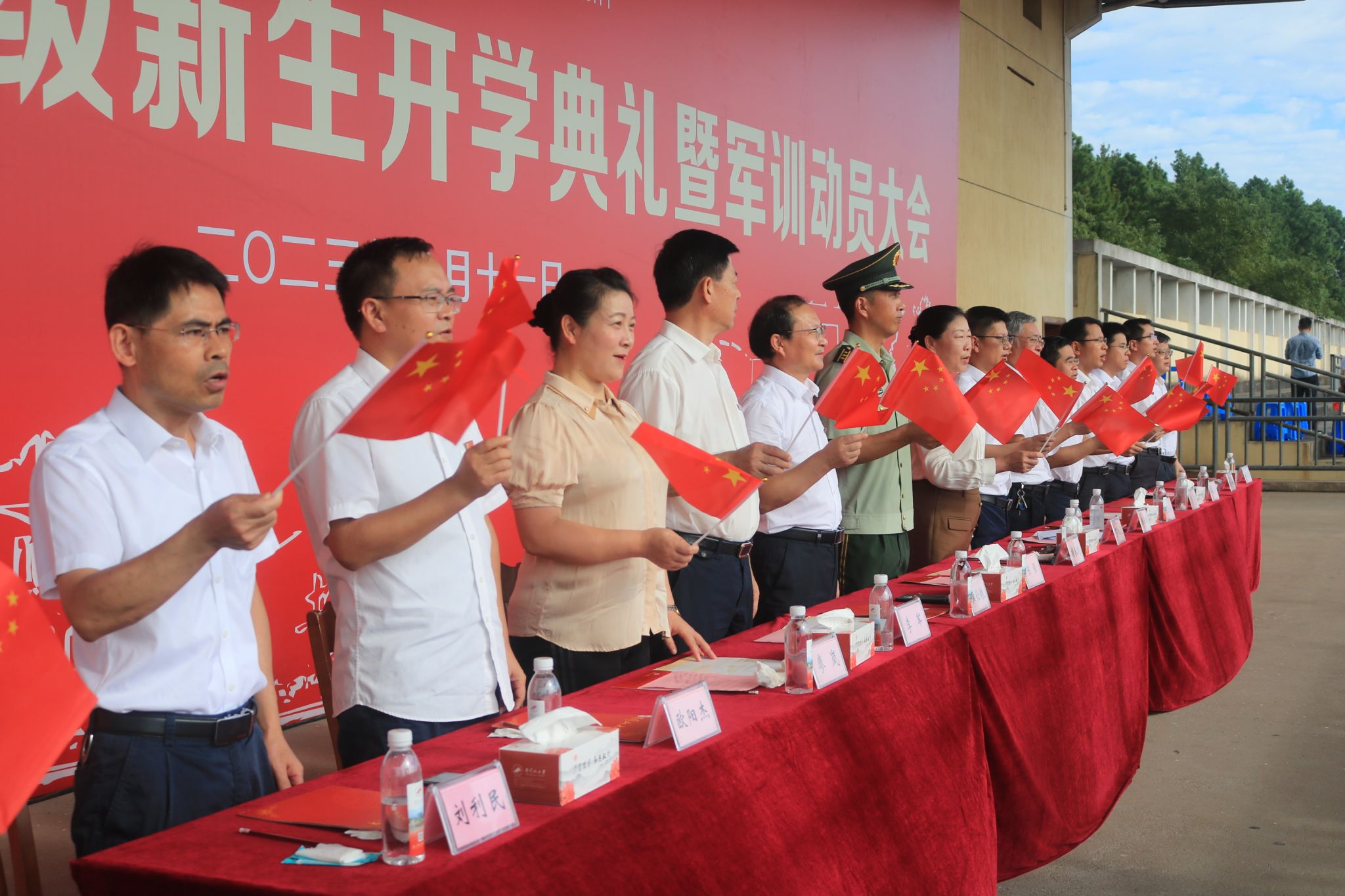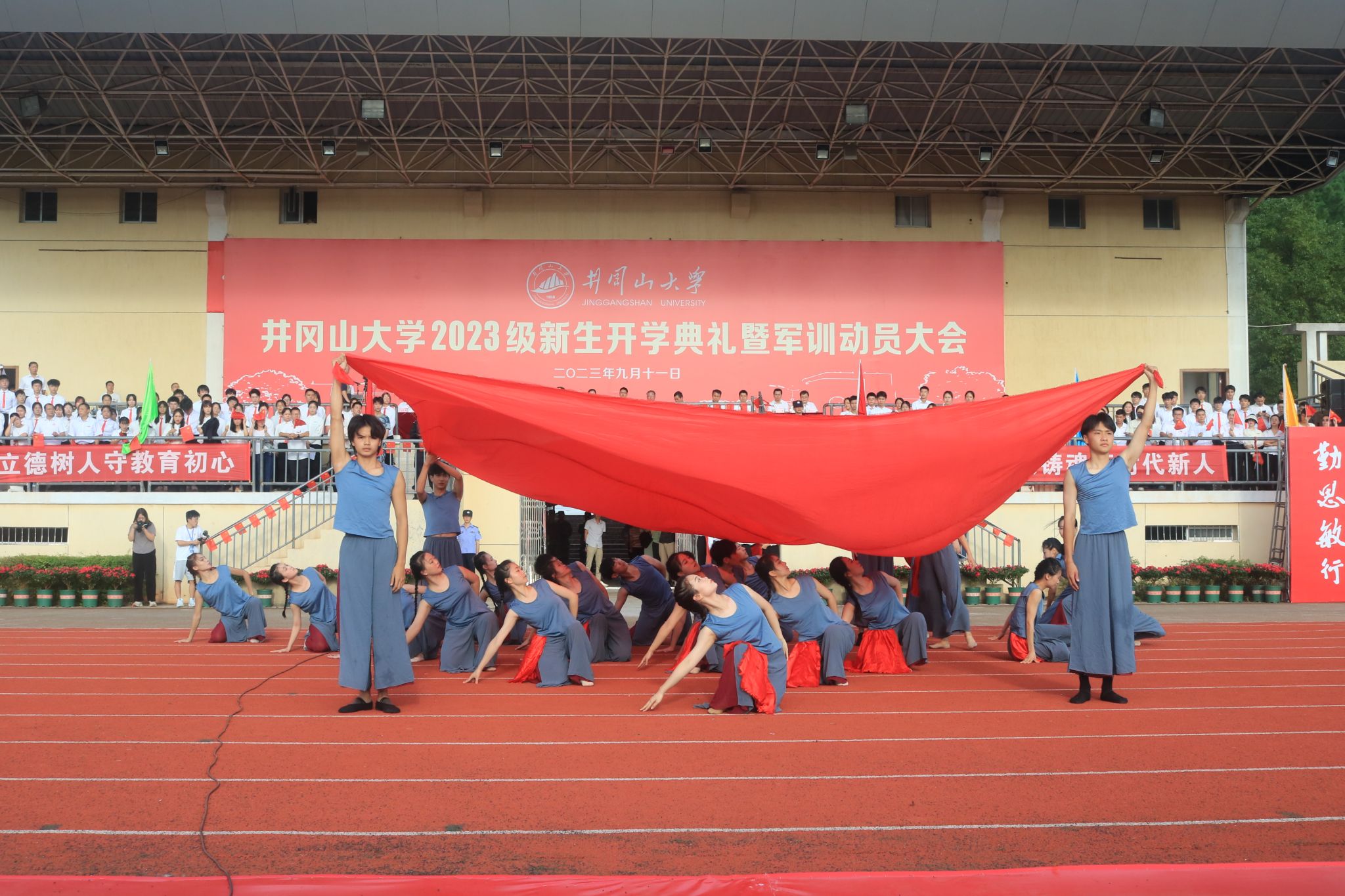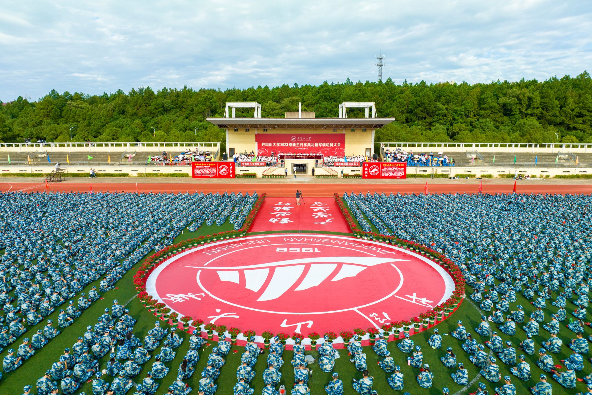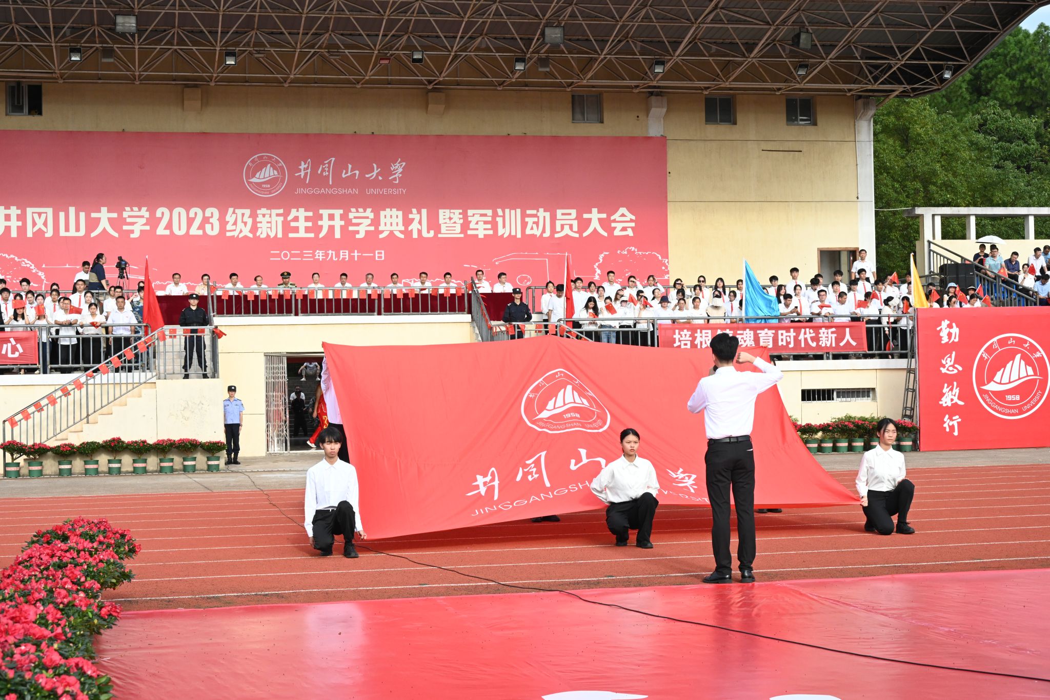 9月11日上午,井冈山大学2023级新生开学典礼暨军训动员大会隆重举行。校党委书记胡春晓出席典礼并为新生军训团授旗,党委副书记、校长罗旭彪致辞,党委常委、副校长刘利民主持仪式,吉安市武警支队支队长陈强作军训动员安排,在家的党政班子成员陈小林、黄俭根、肖宜安、李军、冷明、廖岚、张赫、欧阳杰、肖洪海、刘梁军出席。学校有关部门、学院负责人,教师代表、全体辅导员,以及2023级8500余名新生和他们的班主任共同参加了典礼。开学典礼采取线上网络直播方式,全国广大校友、学生家长、社会友人在“云端”观礼,累计观看人数1.4万,收获点赞6.8万余次。