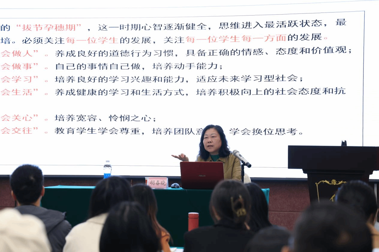 胡春晓为来自省内11市的80位学员作了题为《新时代教师核心素养与自主发展》的讲座。她站在国家发展、民族振兴的高度,为全体学员深入解读了党的十九大以来党的教育方针和习近平总书记关于教育的重要论述,并围绕核心素养的由来及内涵、新时代教师的核心素养和新时代教师的自我发展三大主题,作了深刻的阐述。
