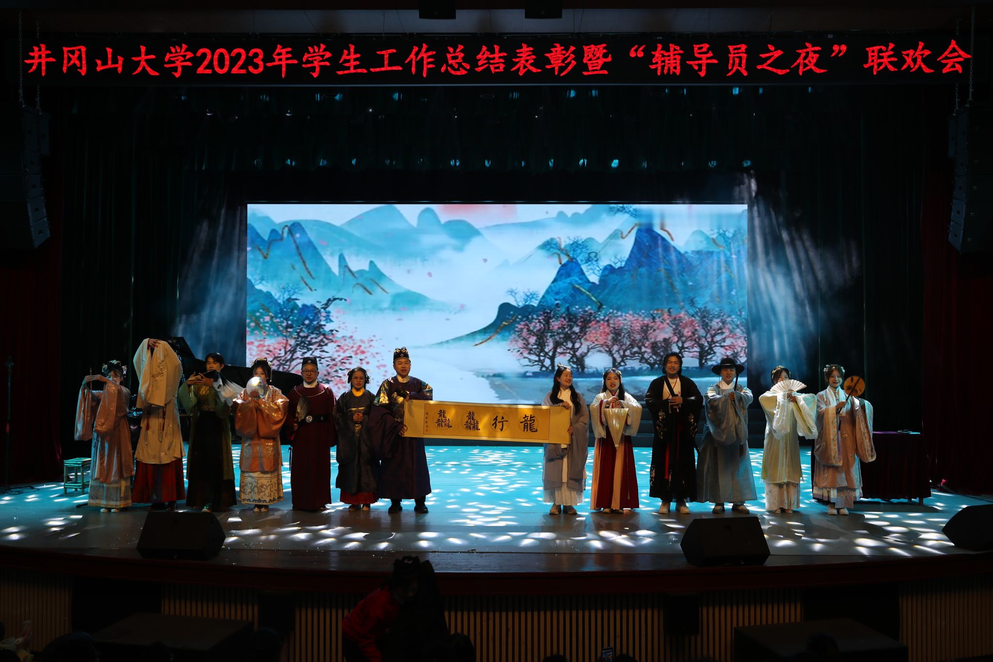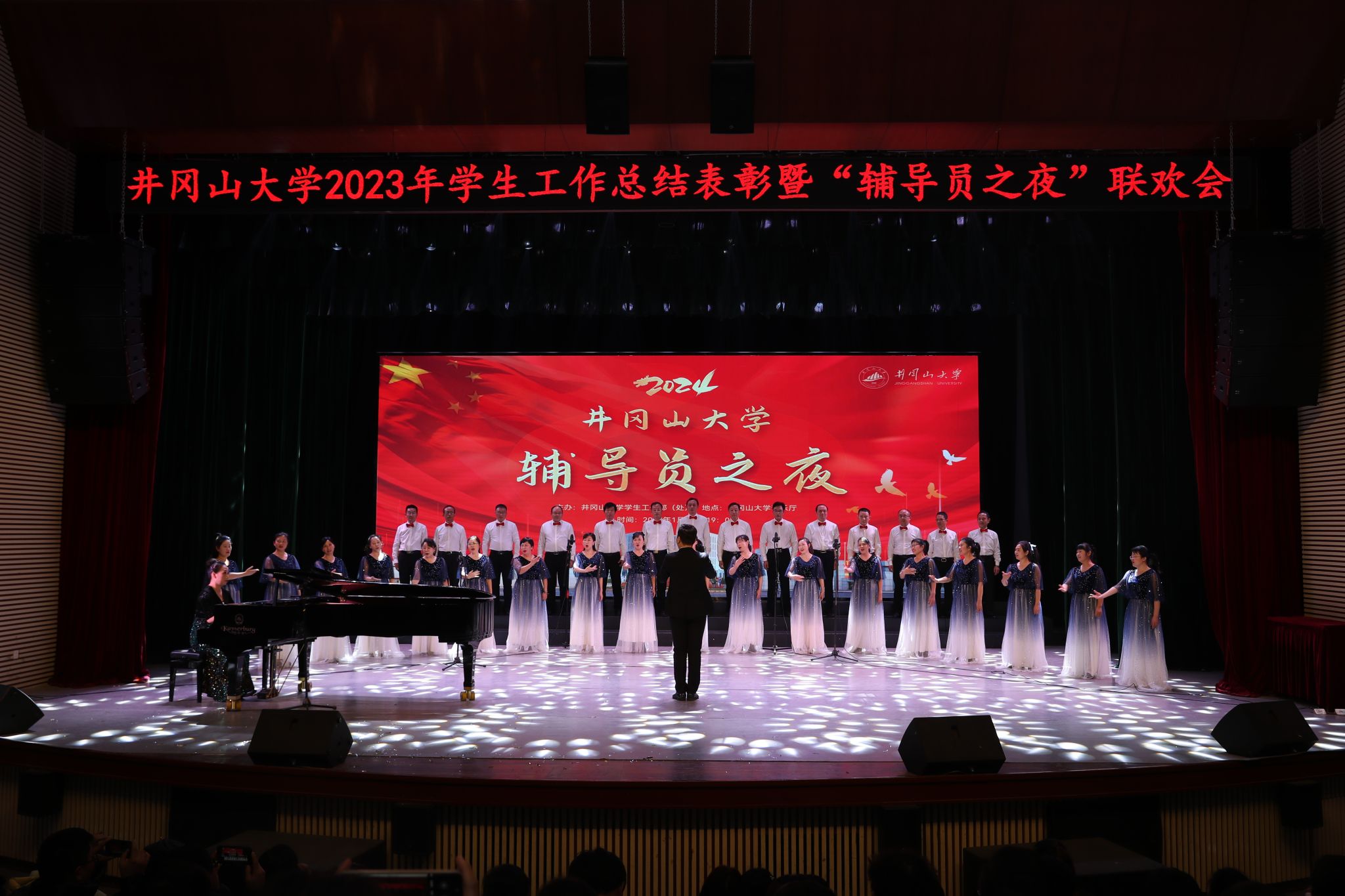 为加强学校辅导员队伍建设,强化工作交流和团队凝聚力,总结工作、交流经验、部署推动今年重点工作,1月12日晚,我校举办2023年学生工作总结表彰暨“辅导员之夜”联欢晚会。校党委书记胡春晓,党委副书记、校长罗旭彪,党委副书记肖宜安,党委常委、副校长刘利民,党委常委、宣传部部长肖洪海出席并为学生工作先进单位和个人颁奖。