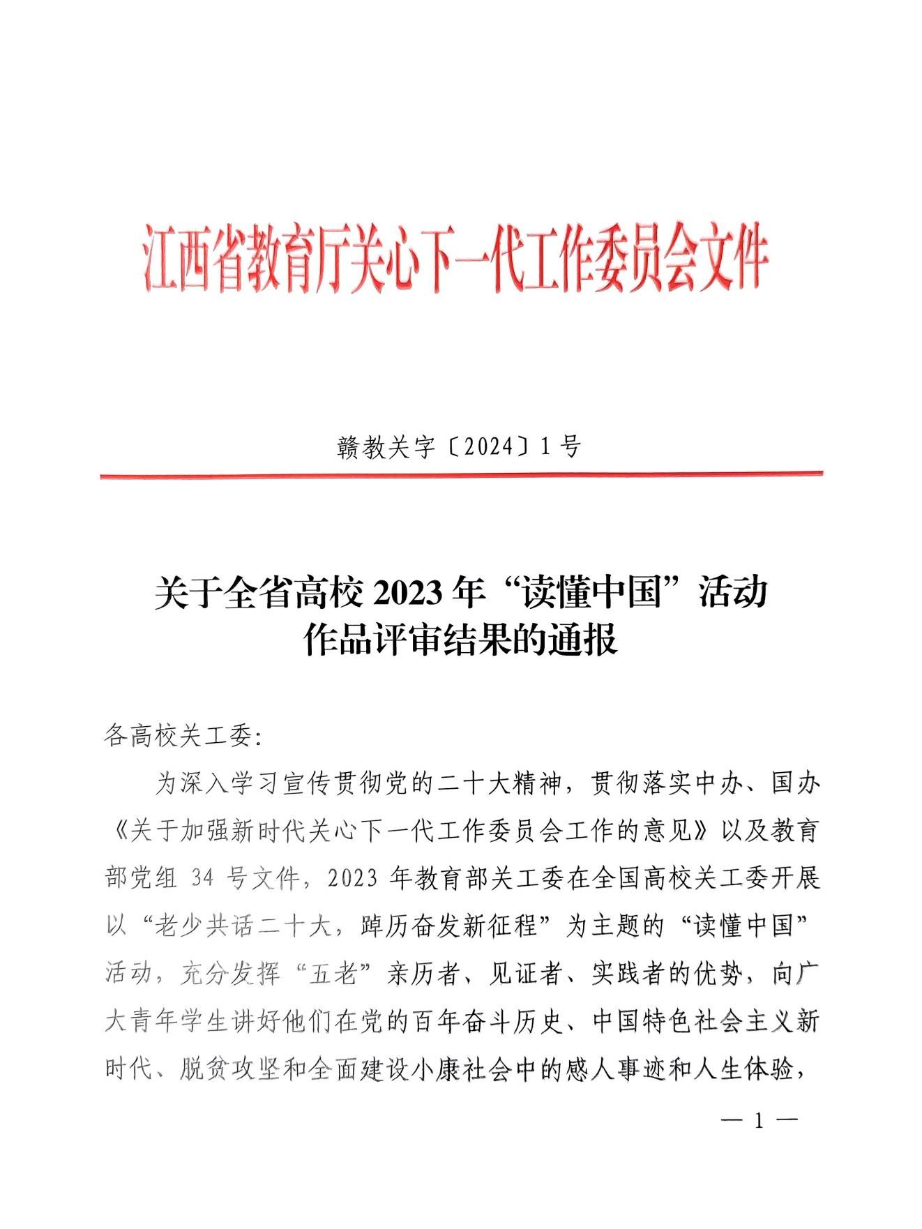 近日,省教育厅关工委发布全省高校2023年“读懂中国”活动作品评审结果,我校选送的征文、微视频、舞台剧获得良好成绩,其中《一片“痴”心献庐陵》获征文一等奖、《用心倾听开花的声音》获征文二等奖、《以爱育人,润物无声》《一路繁华似锦》获征文三等奖、《红色沃土育桃李》获微视频二等奖、《向阳冬升》获舞台剧三等奖。我校还获2023年“读懂中国”活动组织奖。