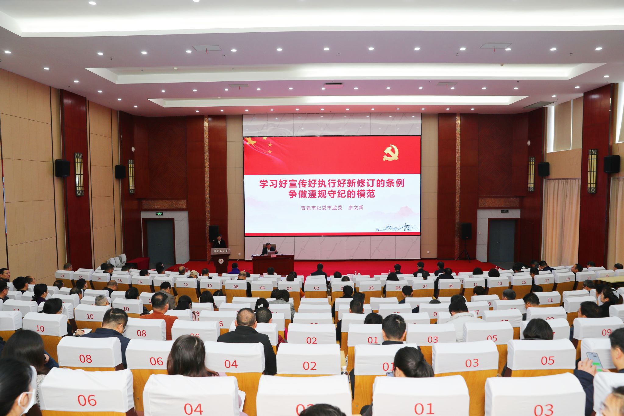 会议邀请了吉安市纪委副书记、市监委副主任廖文新来校作《学习好宣传好执行好新修订的条例 争做遵规守纪的模范》专题辅导报告。廖文新从深刻领悟新修订《条例》的重大意义,准确理解新修订《条例》的主要内容,贯彻执行新修订《条例》的体会和建议三个方面,对新修订的《条例》出台的时代背景、重大意义、重大原则、主要内容和亮点、要点,通过数说《条例》方式,结合翔实的案例,进行了深入浅出的解读。辅导报告进一步加深了党员干部对这部党内重要法规的理解,对学校进一步全面从严治党、推进党风廉政建设具有重要的指导作用。