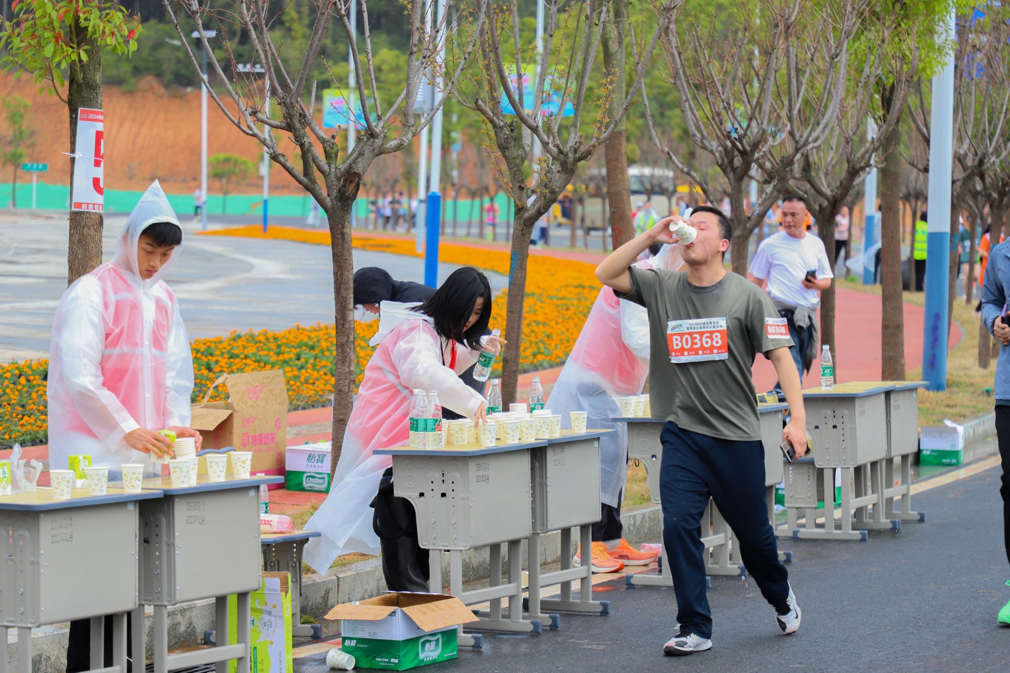 比赛前,志愿者们依据赛事组委会下发的工作安排,明确自身职责和分工,坚守在起点、补给站、医疗站、半马终点好耶欢乐跑终点等关键点位,为比赛的顺利进行提供保障。比赛现场虽细雨纷飞,但这并丝毫没有影响志愿者们的热情,他们严阵以待,随时为参赛选手提供贴心服务。在入场检录处,志愿者们仔细核对运动员信息,井然有序地摆放物品;在能量补给站,他们为运动员准备好茶水和食物,同时为他们加油助威;医疗志愿者积极协助医护人员为运动员提供赛后医疗服务,为各位参赛选手提供健康保障;选手接驳组的志愿者坚守岗位,在运动员到达终点时,及时提供给接驳车引导服务。近2小时的赛事服务,全体志愿者们不辞辛苦、尽职尽责,用他们的热情和敬业确保了赛事全程的顺利进行。