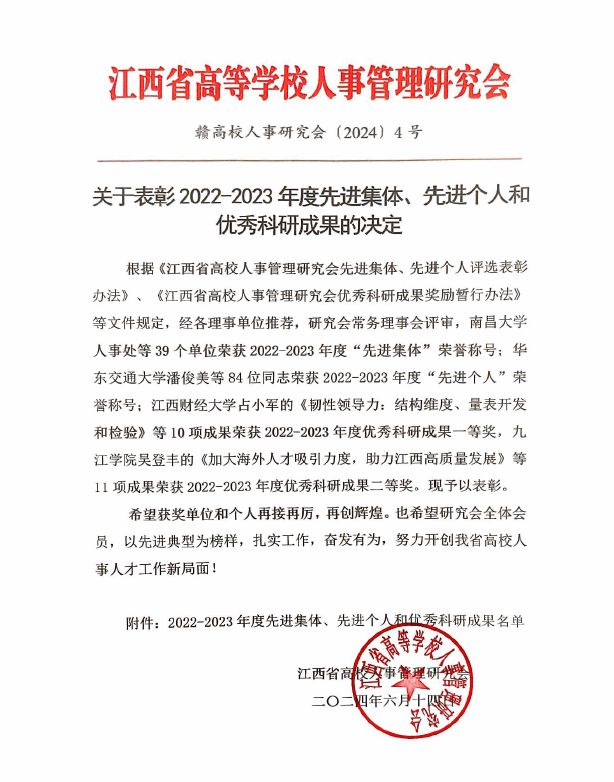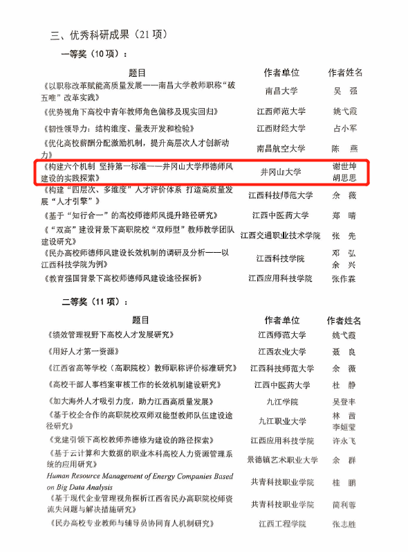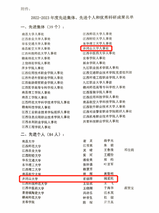 近日,江西省高等学校人事管理研究会发布了《关于表彰2022-2023年度先进集体、先进个人和优秀科研成果的决定》,我校人事处在60多家会员单位中喜获佳绩。其中人事处荣获“先进集体”荣誉称号;曾丽萍、姚爱民等2名同志荣获“先进个人”荣誉称号;由谢世坤、胡思思撰写的《构建六个机制 坚持第一标准——井冈山大学师德师风建设的实践探索》一文荣获优秀科研成果一等奖。(文/图:胡思思 审核:姚爱民 曾建军)
