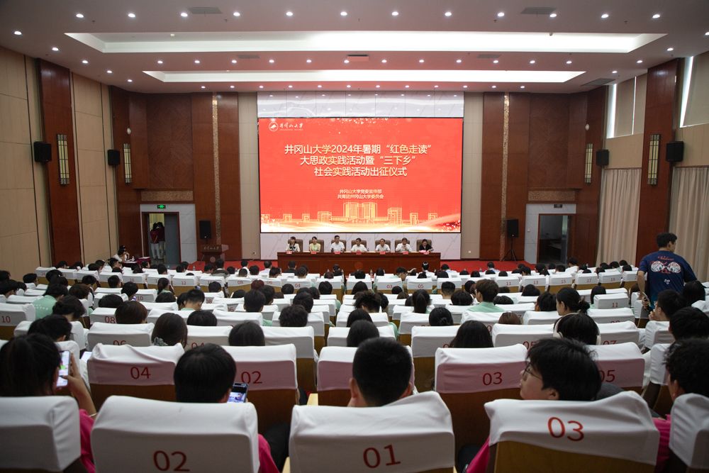 6月26日下午,井冈山大学举行2024年暑期“红色走读”大思政课实践暨“三下乡”社会实践活动出征仪式。校党委副书记肖宜安出席并讲话,校党委常委、副校长敖四江、党委常委、宣传部部长肖洪海出席并为实践团队授旗,党委学生工作部、团委、教务处等部门负责人,各学院党委副书记、团委书记,各实践服务团队师生代表300余人参加出征仪式。