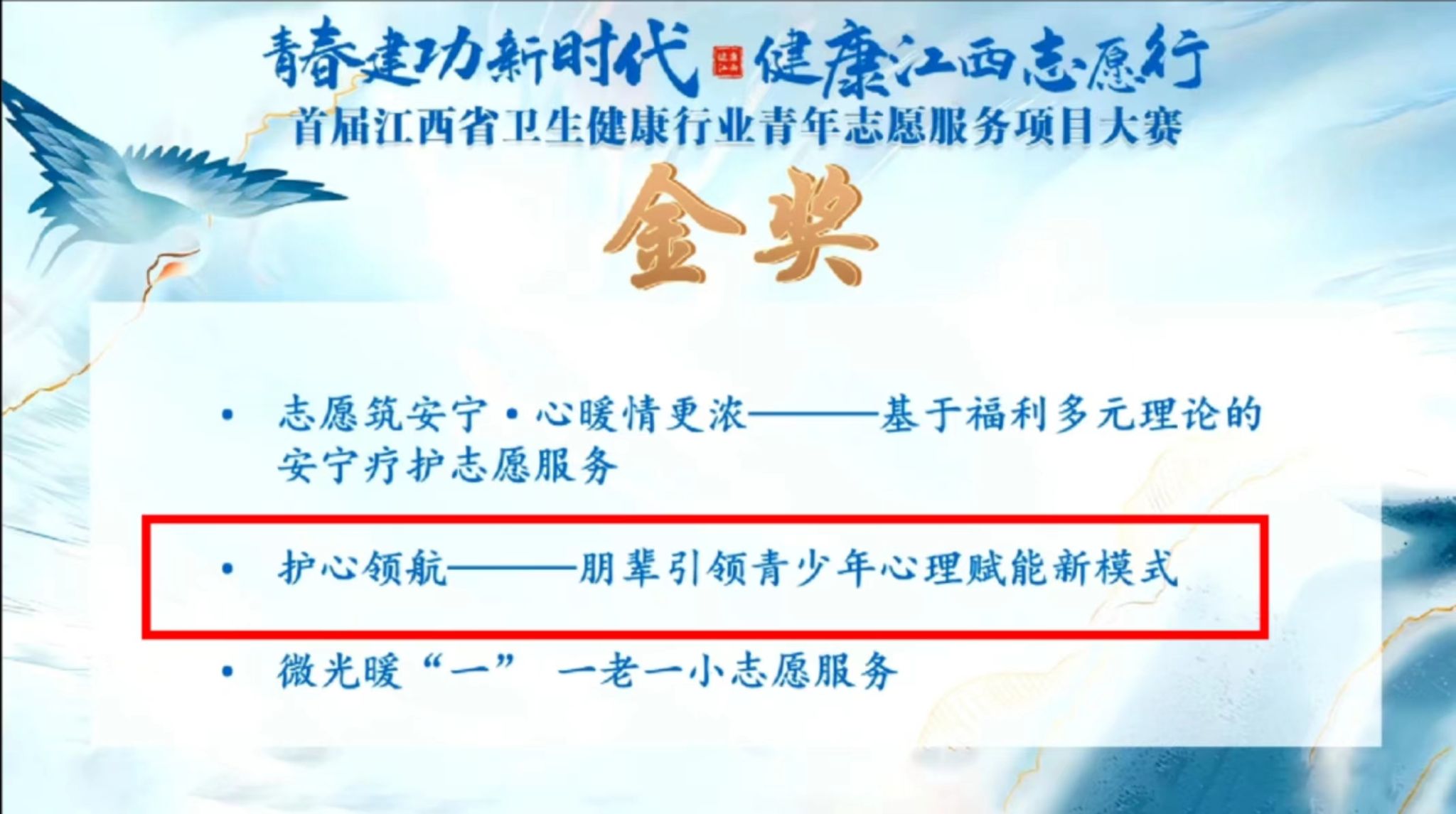 7月26日,由江西省卫生健康委主办,南昌大学第二附属医院、健康江西志愿者联合会共同承办的首届江西省卫生健康行业青年志愿者服务项目大赛决赛举行。全省共有48个志愿服务项目报名参赛。经过初评,最终全省11个设区市共有24个项目进入本次决赛。我校参赛项目《护心领航—朋辈引领青少年心理赋能新模式》经过层层选拔,精彩角逐,在决赛现场表现优异,最终喜获金奖。