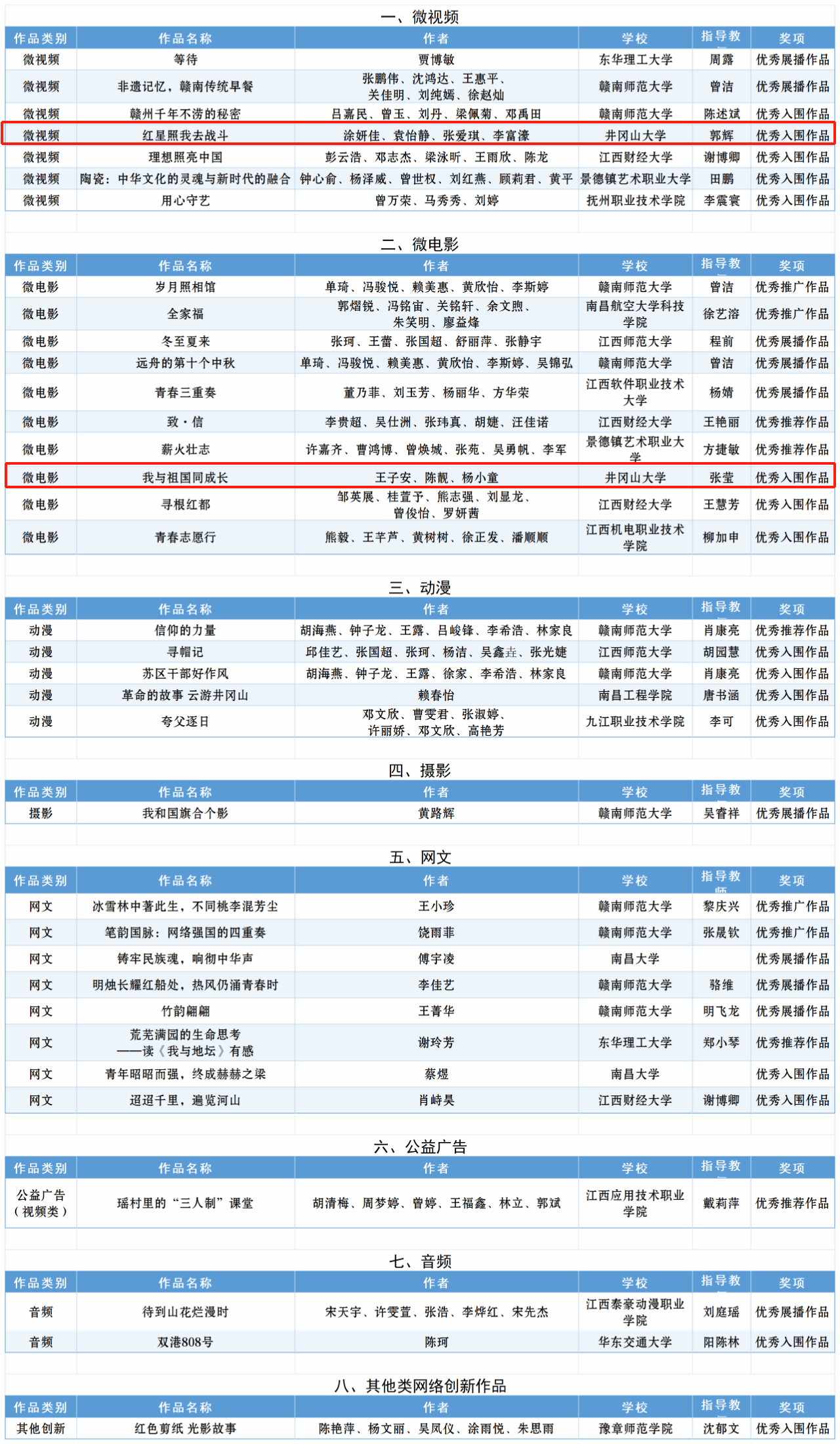 近日,经作品征集、资格审核、专家遴选、作品政审等程序,教育部发布《关于第七届全国大学生网络文化节和全国高校网络教育优秀作品推选展示活动遴选结果的公示》,我校人文学院学子涂妍佳、袁怡静、张爱琪、李富濠创作的微视频《红星照我去战斗》,王子安、陈靓、杨小童创作的微电影《我与祖国同成长》拟入选。(文:李琴;图:来源于教育部、教育厅网站)