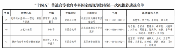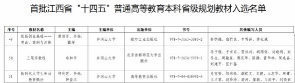 近日,江西省教育厅公布了《关于公布首批江西省“十四五”普通高等教育本科省级规划教材入选、立项建设名单的通知》(赣教高字〔2024〕41号),我校共有6种教材入选,其中《三笔字教程》等3种教材成功入选首批江西省“十四五”普通高等教育本科省级规划教材名单、《物理化学》等3种教材成功入选首批江西省“十四五”普通高等教育本科省级规划教材立项建设名单。同时,《新时代大学生劳动教育概论》等3种教材被教育厅推荐参与“十四五”普通高等教育本科国家级规划教材遴选。