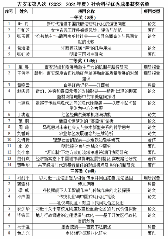 根据《吉安市人民政府办公室关于吉安市第八次(2022—2024年度)社会科学优秀成果的通报》(吉府办字〔2025〕20 号)公示,我校共27项成果获奖,占全市获奖总数的90%,一等奖均为我校成果。我校本次获奖名单中,马克思主义学院获奖7项,人文学院8项,商学院5项,政法学院3项,艺术学院2项,教育学院1项,图书馆1项。具体获奖名单如下: