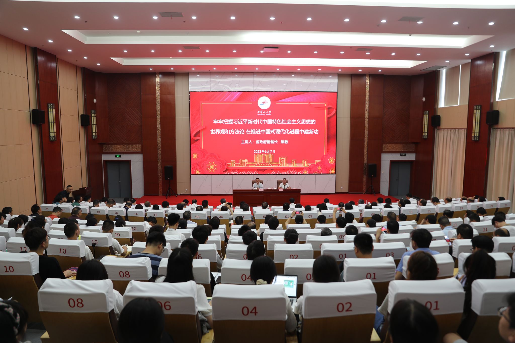 6月7日,联系井冈山大学的省领导,省政府副省长、党组成员陈敏来校,为学校300余名党员干部和师生代表作了题为《牢牢把握习近平新时代中国特色社会主义思想的世界观和方法论 在推进中国式现代化进程中建新功》的专题党课。他强调,广大青年大学生要锤炼忠诚品质,树立远大理想,练就过硬本领,为推进中国式现代化贡献智慧力量。省政府副秘书长杨俊出席,校党委书记胡春晓主持。省政府办公厅相关处室负责同志,全体在家党政领导班子成员和学校处级干部、师生代表聆听了专题党课。