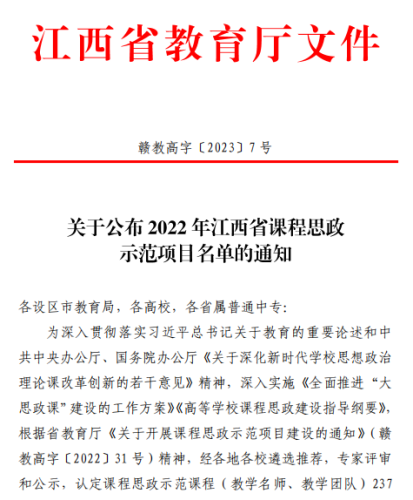 近日,江西省教育厅发布了《关于公布2022年江西省课程思政示范项目名单的通知》(赣教高字〔2023〕7号),我校胡春晓教授主持的“井冈山大学课程思政教学研究中心”入选省课程思政教学研究示范中心,推荐的《红色文艺》等6门本科课程全部被认定为省级课程思政示范课程(教学名师、教学团队),入选课程门数位居全省高校第2。 学校落实立德树人根本任务,与新华网共建课程思政教学研究中心和课程思政教学资源库平台,制定了《井冈山大学课程思政改革实施方案》。学校将充分发挥省级课程思政项目示范引领作用,围绕教师队伍“主力军”、课程建设“主战场”、课堂教学“主渠道”三条主线,把思想政治教育贯穿人才培养全过程,持续推动构建全员全程全方位育人大格局,全面提升人才培养质量。(文:彭曙,审核:何德勇 黄族豪)