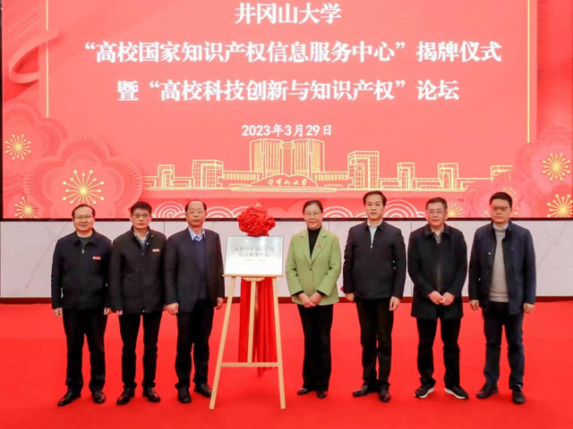 3月29日下午,井冈山大学“高校国家知识产权信息服务中心”揭牌仪式在校举行。井冈山大学党委书记胡春晓和吉安市市场监督管理局局长刘建平共同为井冈山大学“高校国家知识产权信息服务中心”揭牌,党委副书记、校长罗旭彪致辞,井冈山大学党委常委、副校长陈小林主持仪式,井冈山大学党委常委、副校长黄俭根,国家知识产权培训(江西)基地主任、华东交通大学人文学院党委书记张祥志等出席。吉安市各县(区、市)市场监督管理局的领导和有关企业的专家,学校相关职能部门、学院(部)负责人,相关学科负责人以及四个产业学院负责人等参加了会议。