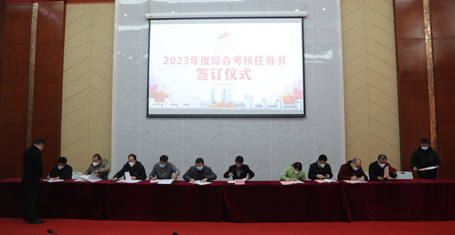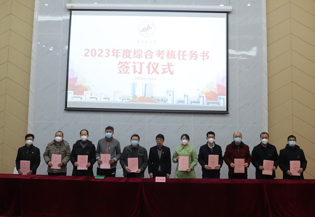 1月6日上午,学校与校属各单位举行综合考核任务书签订仪式,党委书记胡春晓出席,党委副书记、校长罗旭彪代表学校与15个教学学院(部)行政主要负责人,21个目标管理部门、单位主要负责以及12个非目标管理部门主要负责人签订综合考核任务书。党委副书记刘祖文主持仪式并作2023年度校属各单位综合考核任务书的起草说明,史胜平、陈小林、黄俭根、肖宜安、李军、刘利民、冷明、廖岚、欧阳杰、肖洪海、刘梁军等党政班子成员出席。