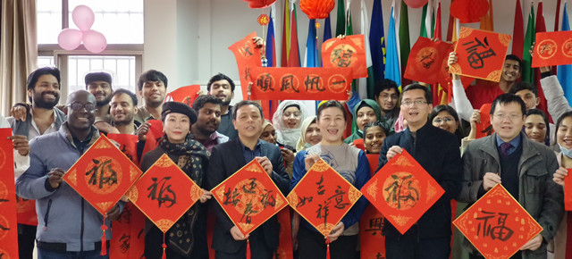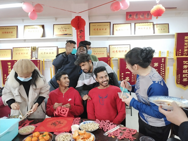 在留学生活动室,留学生正在挂灯笼、剪窗花、包饺子、写春联……大家分工合作,其乐融融。走访慰问结束后,廖岚一行来到了留学生活动中心,与30多名留校留学生一起交流互动,祝福留学生们今后的日子里心想事成、大展宏图,希望他们今天以井大为荣,将来井大以他们为荣。