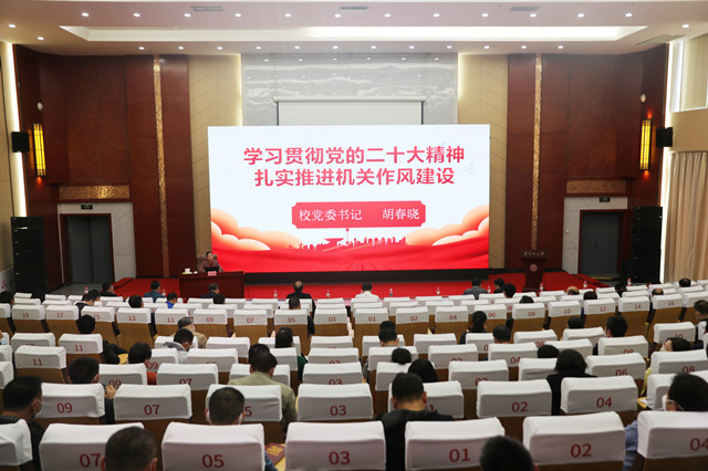 11月28日下午,学校在图书馆报告厅举办学习贯彻党的二十大精神宣讲报告会,校党委书记胡春晓为机关干部作题为《学习贯彻党的二十大精神 扎实推进机关作风建设》的宣讲报告,提出贯彻落实要求。学校机关党委和直属单位党委150余名科级以上干部聆听报告,机关党委主要负责人主持报告会。