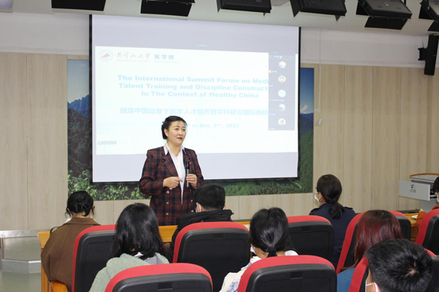 廖岚代表学校对论坛的举办表示祝贺,对在云端开展讲座的专家表示诚挚欢迎,对专家们长期以来给予井冈山大学医学教育的大力支持和帮助表示衷心感谢。廖岚介绍了井冈山大学医学教育的积极成效及在健康中国背景下,我校大力推进医学人才培养国际化交流的举措,表达了对我校医学教育发展的美好愿景。作为口腔医学专家,廖岚教授详细介绍了张海教授的科研背景及学术造诣,并分享了此前与张教授在美国学习交流的经历。她希望本次论坛的成功举办,能有力推动我校医学教育国际化,开拓国际视野,促进本科及研究生教育水平提升,进一步助力我校医学教育的高质量发展。