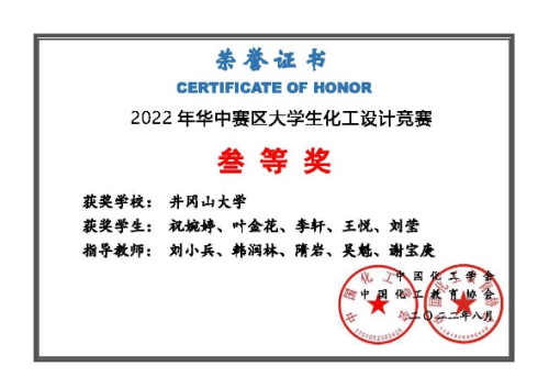 由化学化工学院韩润林、张闻、刘小兵三位老师指导,吴晶晶、钟林峰、胡鹏飞、李佳敏、霍雅琪五位同学所组成的“醇色撩人”团队提交的作品“杰瑞化工(新疆)有限公司10万吨/年1,4-丁二醇生产项目”喜获全国二等奖。由刘小兵、韩润林、隋岩、吴魁、谢宝庚指导,祝婉婷、叶金花、李轩、王悦、刘莹五位同学组成的“隔壁有个小队”提交的作品喜获华中赛区三等奖。实现了井冈山大学在全国大学生化工设计竞赛的新突破。