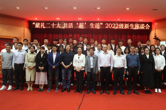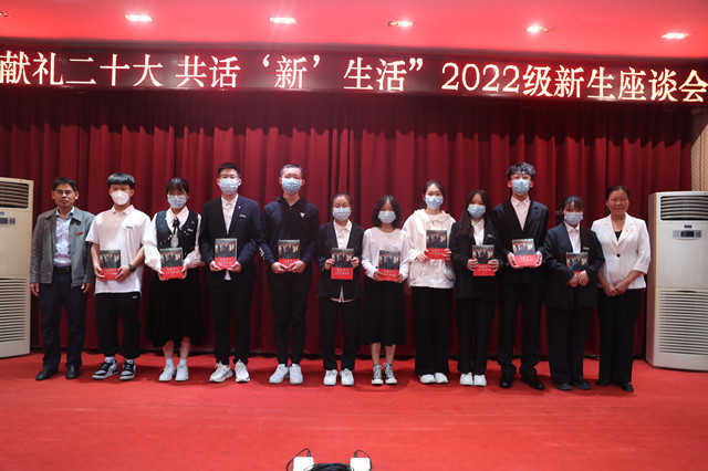 座谈会上,胡春晓还为本次活动“十佳留言”学生赠送书籍《习近平与大学生同学们》,校领导和职能部门负责人与全校新生代表合影留念。(文/图:胡正佩 审核:毛金文、郭伟清、胡正佩)
