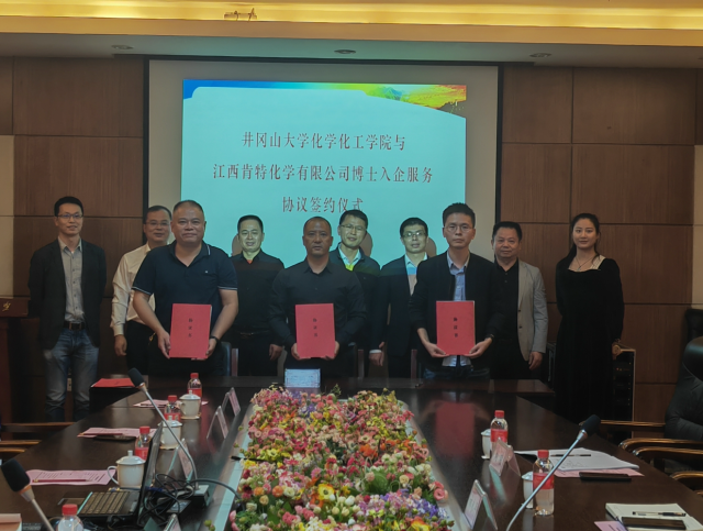 10月19日,化学化工学院与江西肯特化学有限公司在学校举行新材料现代产业学院框架合作协议和博士入企服务协议签订仪式。井冈山大学党委常委、副校长冷明,科研处和化学化工学院负责人,江西肯特化学有限公司总经理林永平等出席签约仪式。化学化工学院院长陈文通与林永平分别代表双方签订了新材料现代产业学院框架合作协议,钟鸿和黄伟两位老师分别与林永平总经理签订了博士入企服务协议。