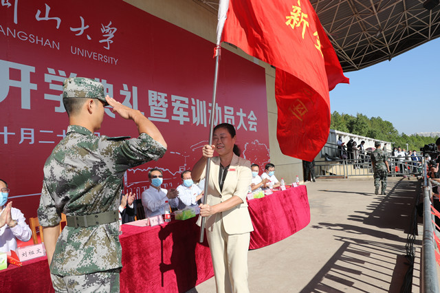 党委书记胡春晓为新生军训团授旗