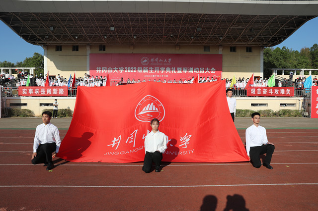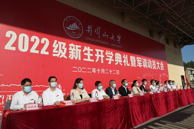 10月22日上午,井冈山大学2022级新生开学典礼暨军训动员大会隆重举行,党委书记胡春晓出席典礼并为新生军训团授旗,党委副书记、校长罗旭彪讲话,党委常委、副校长刘利民主持仪式,学校武装部负责人作军训动员和安排,在家的党委常委班子成员刘祖文、史胜平、陈小林、黄俭根、肖宜安、李军、冷明、廖岚、欧阳杰、肖洪海、刘梁军出席,有关部门、学院负责人,教师代表、全体辅导员、2022级班主任、 2022年新进教师,以及 2022级7600余名研究生、本科生和专升本学生参加了典礼。
