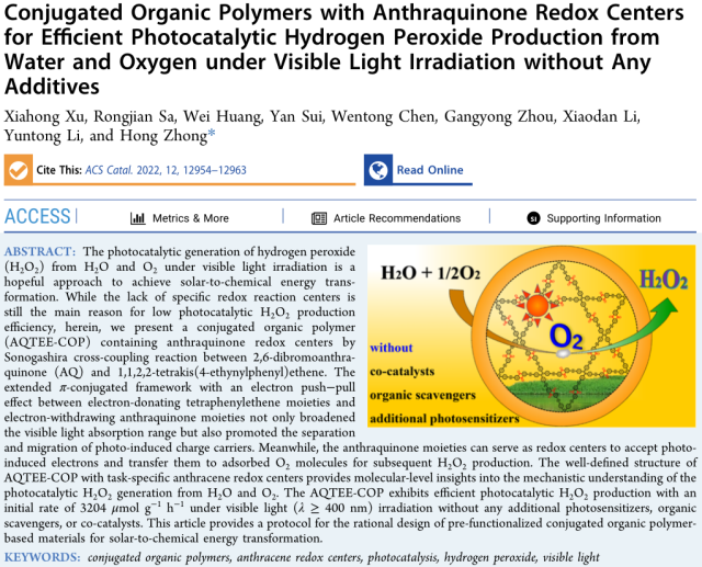 近日,我校化学化工学院钟鸿博士团队在美国化学会旗舰期刊,国际公认的催化领域顶级期刊《ACS Catalysis》(IF=13.7)发表题为“Conjugated Organic Polymers with Anthraquinone Redox Centers for Efficient Photocatalytic Hydrogen Peroxide Production from Water and Oxygen under Visible Light Irradiation without Any Additives”的文章,博士研究生徐霞红为第一作者,我校为论文第一单位和唯一通讯单位。研究得到了国家自然科学基金(22075286,22165015)、江西省教育厅科技项目(GJJ211003,GJJ201001)、井冈山大学博士科研启动项目等项目的资助。