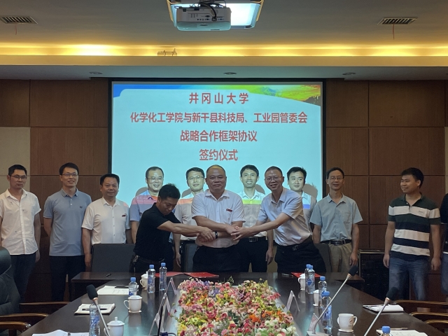 7月26日,化学化工学院与新干县科技局、工业园区管委会在井冈山大学正式签署战略合作框架协议,井冈山大学党委常委、副校长冷明和新干县副县长杨成奎分别致辞,化学化工学院院长陈文通与新干县科技局局长朱年庆、工业园区管委会党工委书记聂朝胜签订了战略合作框架协议。