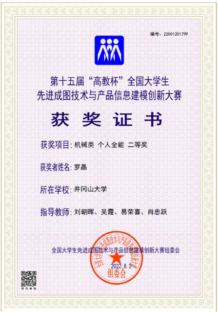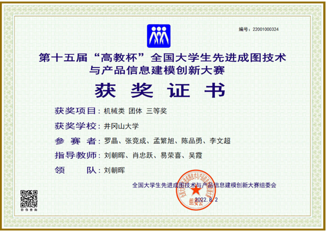 在日前举办的第十五届“高教杯”全国大学生先进成图技术与产品信息建模创新大赛中,机电工程学院2020级机制专业罗晶等5位同学获奖,其中罗晶同学荣获个人全能二等奖,陈品勇、李文超、孟繁旭、张竞成四位同学均荣获个人全能三等奖,机电工程学院荣获机械类团体三等奖。刘朝晖、肖忠跃、易荣喜、吴霞4位老师荣获优秀指导老师。