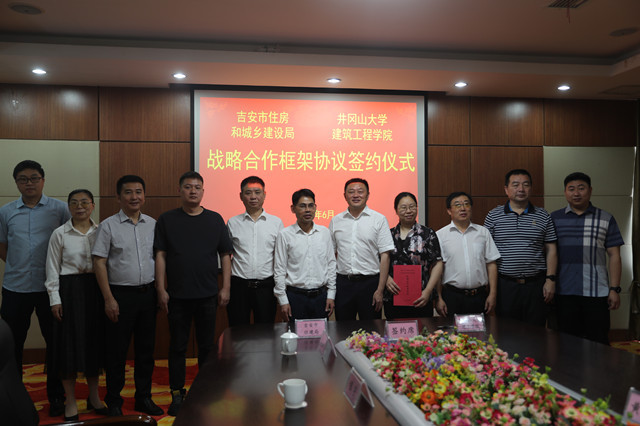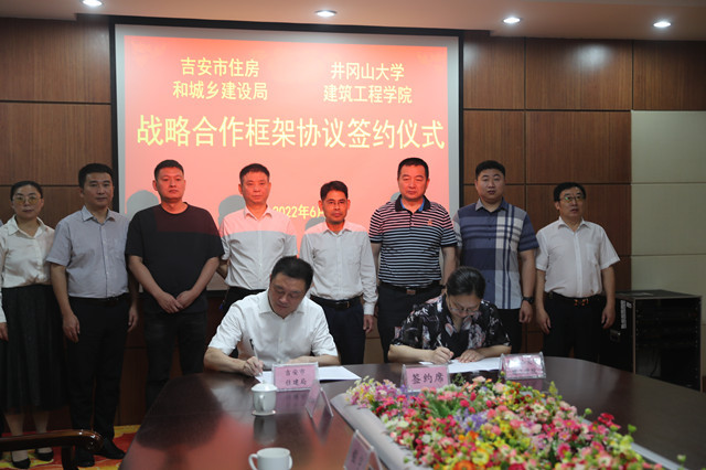 6月14日,井冈山大学建筑工程学院与吉安市住房和城乡建设局举行战略合作框架协议签订仪式。党委常委、副校长刘利民,吉安市住房和城乡建设局党委书记、局长陈克龙,吉安市住房和城乡建设局党委委员、副局长、一级调研员匡炳祥,吉安市住房和城乡建设局总工程师黄邦初等出席校地战略合作框架协议签订仪式。陈克龙和我校建筑工程学院院长罗春泳分别代表双方签约。