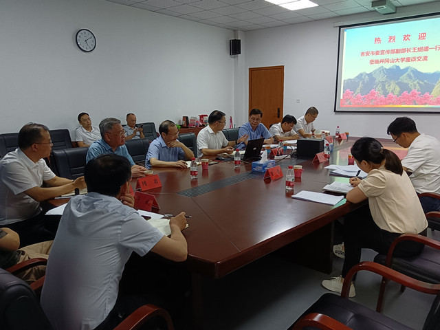 6月15日下午,吉安市委宣传部副部长王绍德一行来我校,就进一步做好红色文化研究和宣传工作开展座谈交流。党委副书记、校长曾建平出席并讲话,党委常委、副校长陈小林、黄俭根,党委常委、宣传部长肖洪海出席,科研处负责人主持会议。井冈山研究中心负责人及相关人员、马克思主义学院和人文学院教师代表参加了座谈。