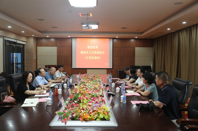 7月5日,湖南农业大学副校长吴波,率该校有关部门负责人一行来校,正式邀请学校领导和相关专家学者参加8月份由该校主办的“两山一区”科教联盟成立大会,双方还并就成立大会的相关事宜进行了交流和探讨。党委常委、副校长黄俭根出席了座谈交流会,学校相关对口部门负责人参加。