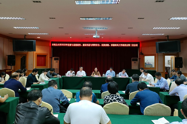 5月26日,学校召开2022年党建与思政、意识形态与网络安全、民族宗教、师德师风工作联席会第二次会议,分析研判当前形势任务,安排部署近期重点工作,推动落细落实工作责任。校党委书记胡春晓出席会议并讲话,党委副书记刘祖文主持会议,校领导史胜平、黄俭根、刘利民以及党委常委欧阳杰、肖洪海、刘梁军出席会议,学校意识形态工作领导小组、党建工作领导小组、思想政治工作领导小组、民族宗教工作领导小组、网络安全与信息化领导小组、师德师风建设与监督委员会成员单位主要负责人参加了会议,党委组织部、宣传部、统战部、教师工作部和网络信息中心处级以上干部参加了会议。