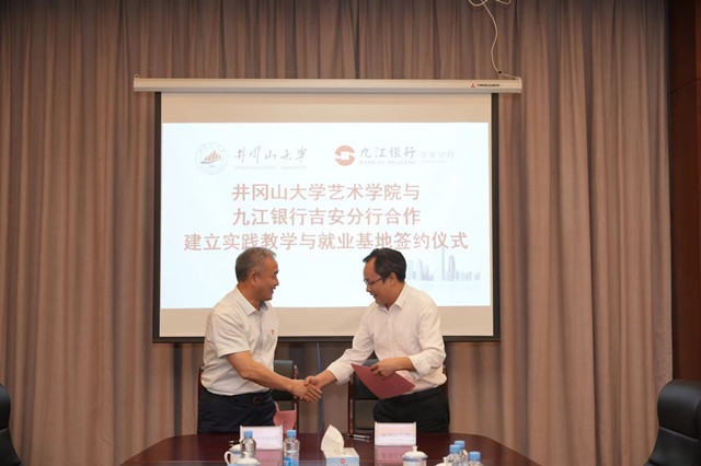 座谈会上,艺术学院与九江银行吉安分行签订了合作建立实践教学与就业基地协议。