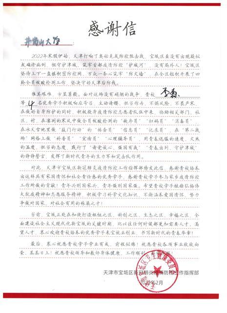 天津市宝坻区新冠肺炎疫情防控工作指挥部为此专门在信中感谢学校培养出这样具有家国情怀和社会责任感的优秀学子,感谢我校学子参与家乡疫情防控工作所做的贡献。希望我校学子继续弘扬伟大抗疫精神和志愿服务精神,积极学习科学文化知识,不断涵养爱国情怀,努カ争做对国家、对社会有用的栋梁之才,并热忱欢迎我校培养的优秀学子到天津市宝坻区就业创业,书写新时代的青春华章。(文:涂妍佳、张欣颖 审核:黎文森、郭伟清、胡正佩)