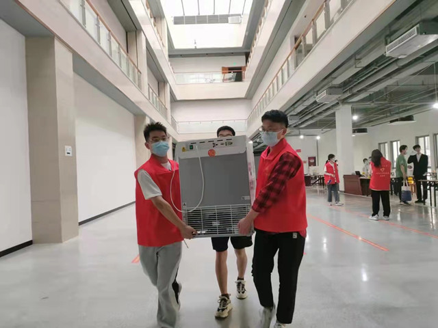 在老学术交流中心隔离点,值班的同学更为辛苦。他们不仅要送餐送水还要负责隔离同学的登记和引导工作。登记和引导工作,值班时间长、任务重。第十五期红志班班长王朝说:“我负责的是周二从下午一点到晚上八点这一个时间段,上午是满4节课,上午值班的同学下午也是满课,为了让他中午能休息一下,上午下了课,我迅速吃完午饭赶到值班地点替换他。整个值班过程,给我最大的感触就是每一位坚守在工作岗位的防疫工作人员,我们生活在安全的环境下,都离不开他们的默默奉献,越是这个时候我们越要共克时艰、众志成城!”