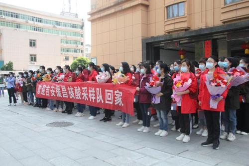 4月11日,吉安市援昌核酸应急采样队在圆满完成抗疫任务返回吉安,经过10天的集中隔离,现已顺利出关,之后将进行4天的居家健康监测。上午10时,市疫情防控指挥部有关领导专程到隔离点迎接,举行了简短而热烈的迎接仪式。附属医院领导到场迎接援昌核酸应急采样队。