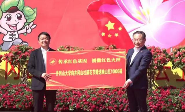 在开幕式现场,曾建平代表学校向井冈山杜鹃花节赠送了1万株“中国红”的杜鹃花,并现场介绍了学校赠花的初衷。“以井冈山命名的井冈山大学,始终坚持以井冈山精神铸魂育人,始终将红色作为学校的最大特色、最富资源、最亮品牌、最深底色。今天,井冈山大学‘映山红’团队来到井冈山,开展以‘传承红色基因、播撒红色火种’为主题的赠送映山红活动,既是我校大学生创新创业团队走进革命老区了解国情民情、服务老区百姓的具体实践,更是我们弘扬井冈山精神的重要体现。”曾建平表示,“映山红是红色杜鹃花,它生于贫瘠荒凉之地,却能顽强生长。希望新一代青年学子像一丛丛红色杜鹃一样,努力为传承红色基因、赓续红色血脉贡献青春力量。”