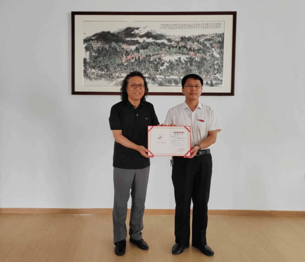 6月21日下午,我校艺术学院柳时浩博士(韩国籍)向学校捐赠一幅山水国画作品《井冈山下》。在捐赠仪式上,校党委常委、副校长冷明教授向柳时浩博士颁发了捐赠证书,感谢柳时浩博士的爱心奉献以及对学校校友会工作的支持。艺术学院、对外联络(校友服务)中心相关负责人参加了捐赠仪式。