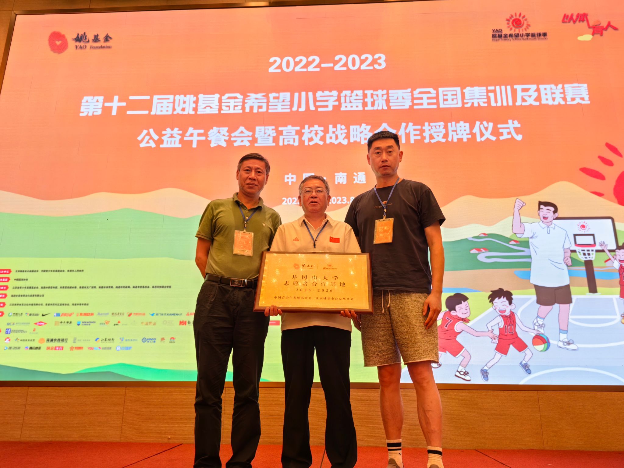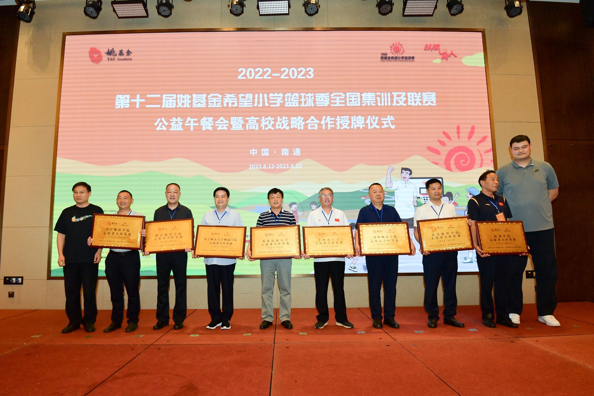 8月18日,在2022—2023第十二届姚基金希望小学篮球季全国集训及联赛期间,姚基金创始人、中国篮协主席姚明和教育部中外语言交流合作中心党委副书记宋永波为高校战略合作基地授牌。校党委常委、副校长陈小林代表学校接受志愿者合作基地授牌,全国仅八所高校获此殊荣。