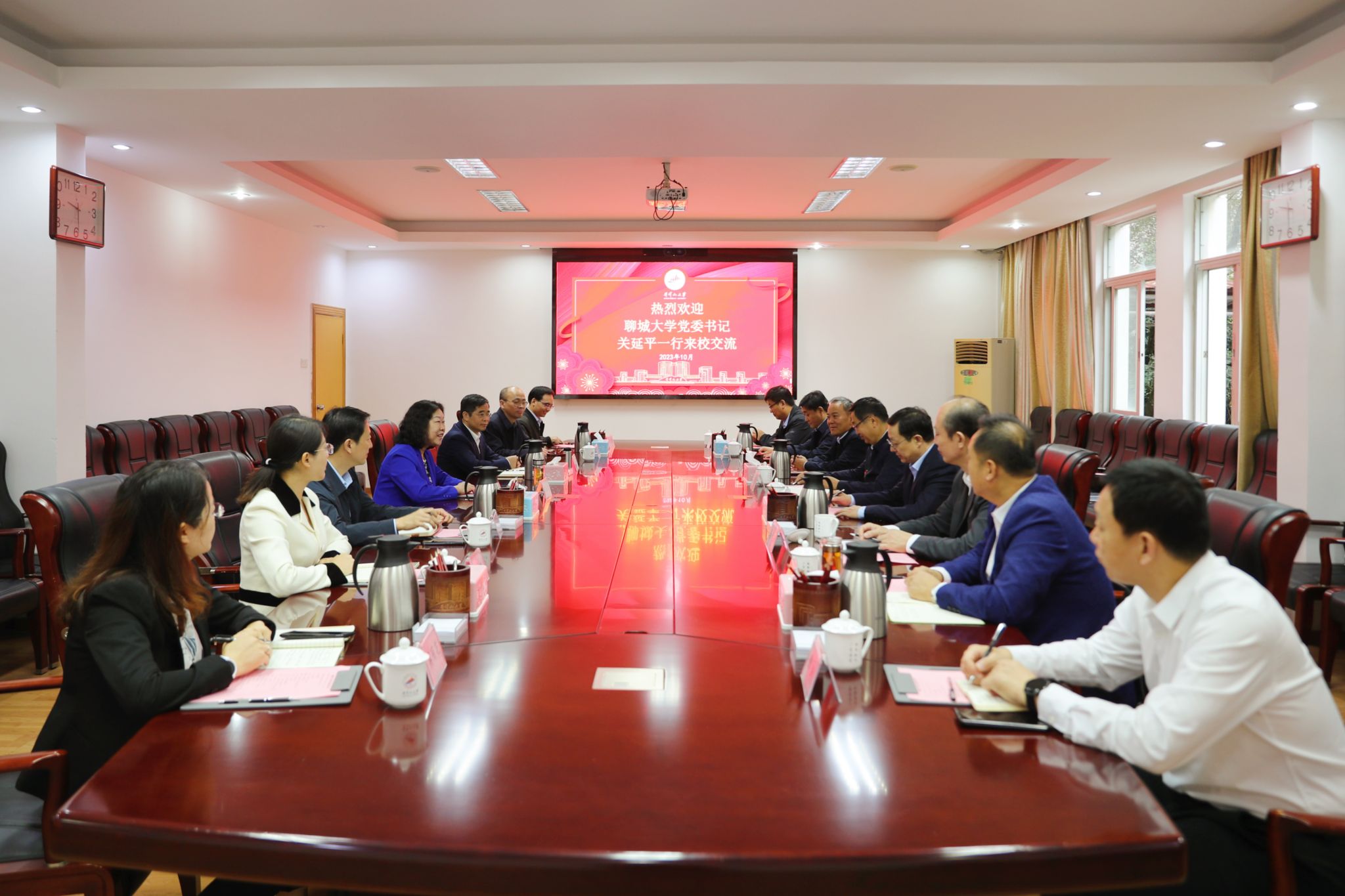 10月20日,聊城大学党委书记关延平,党委副书记胡海泉、党委副书记房增福 ,聊城大学党委常委、组织部部长庄波一行8人来校,就应用型人才培养、学科专业建设、校地校企融合等方面工作进行考察交流。校党委书记胡春晓出席座谈会并讲话,党委副书记、校长罗旭彪会见了关延平一行,党委常委、副校长肖宜安及相关部门负责人参加座谈会。
