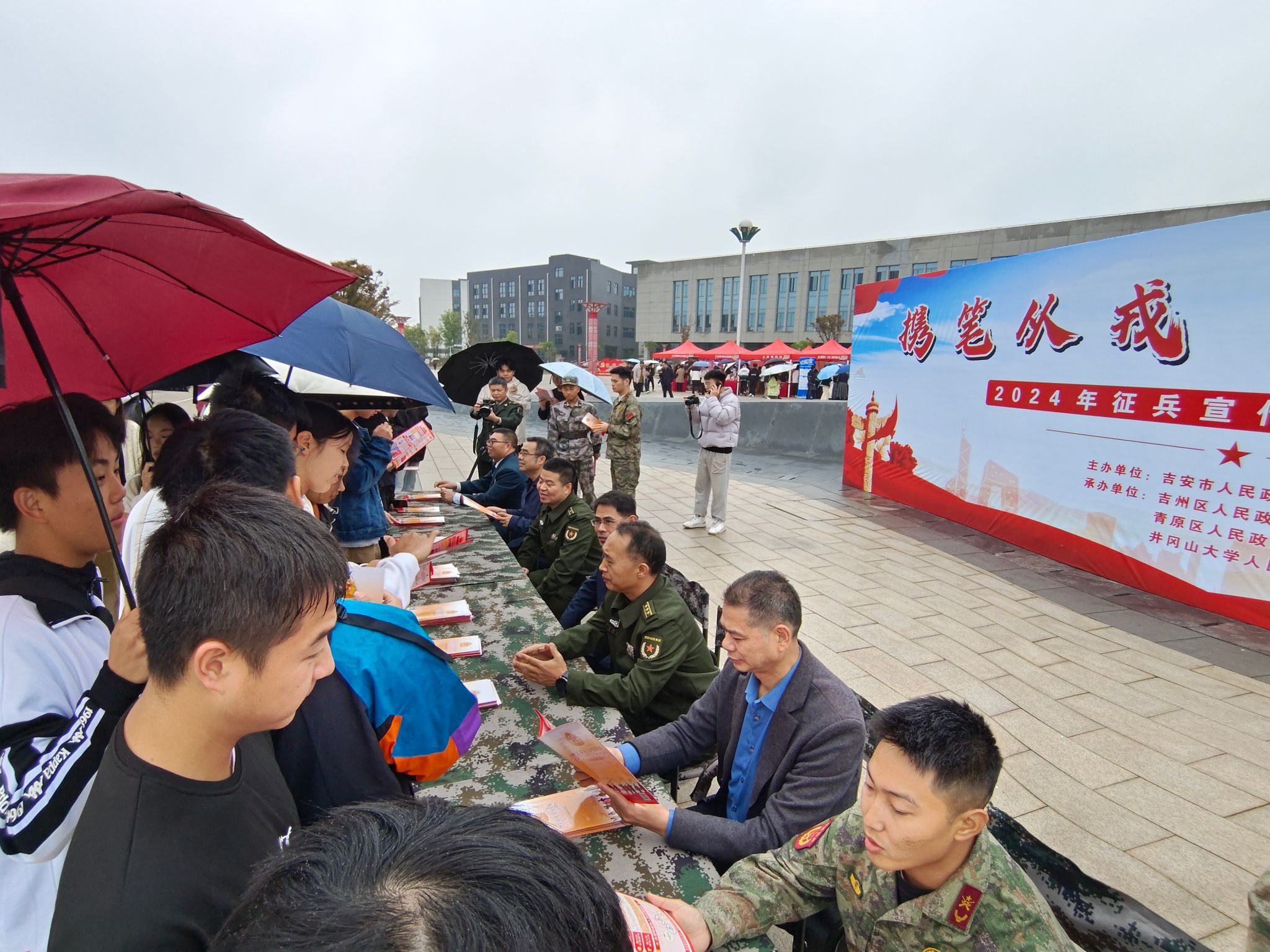 11月11日上午,由吉安市人民政府征兵办主办,吉州区、青原区人民政府征兵办和我校人武部承办的“携笔从戎、绽放青春”——2024年征兵宣传活动在校举行。校党委常委、副校长刘利民,青原区区委常委、武装部长王昭伟,吉州区区委常委、武装部长蒋国平以及我校人武部主要负责人来到活动现场,向大学生宣传入伍政策、答疑解惑。