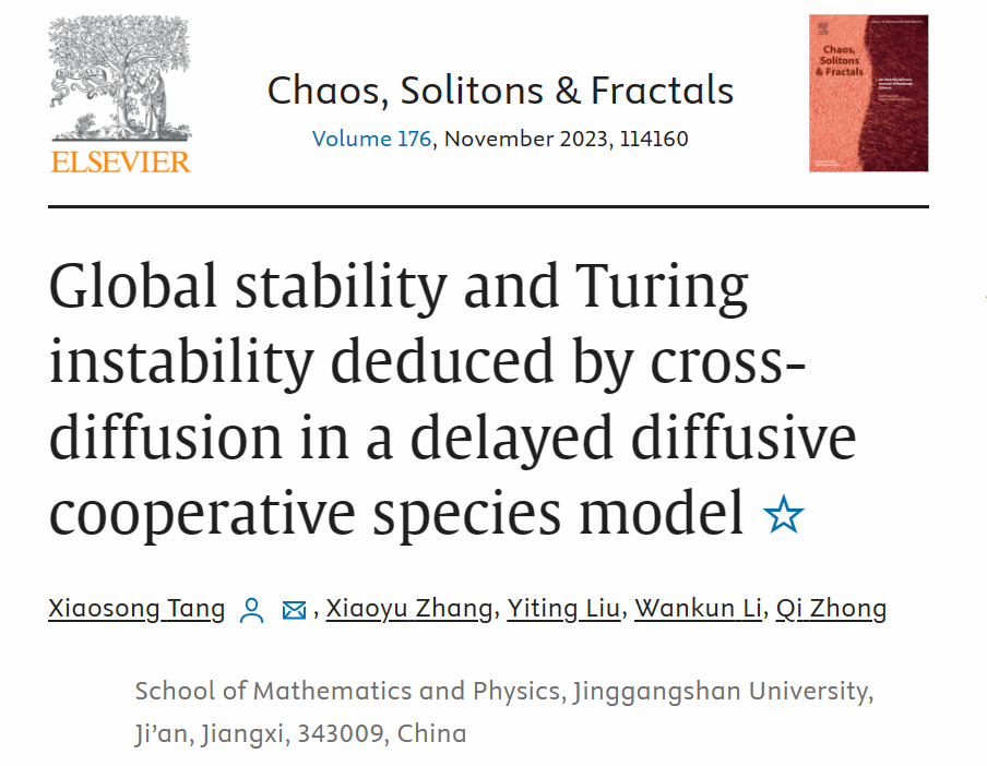 近日,我校数理学院汤小松博士团队在中科院1区Top期刊《Chaos, Solitons & Fractals》(IF=7.8,JCR分区Q1)上发表题为“Global stability and Turing instability deduced by cross-diffusion in a delayed diffusive cooperative species model”的研究论文。这是该团队继2020年在中科院1区Top期刊《Applied Mathematics Letters》后发表的又一篇高水平论文。研究得到了国家自然科学基金(12261050,62062042)、江西省教育厅科技项目(GJJ2201612,GJJ201015)等项目的资助。