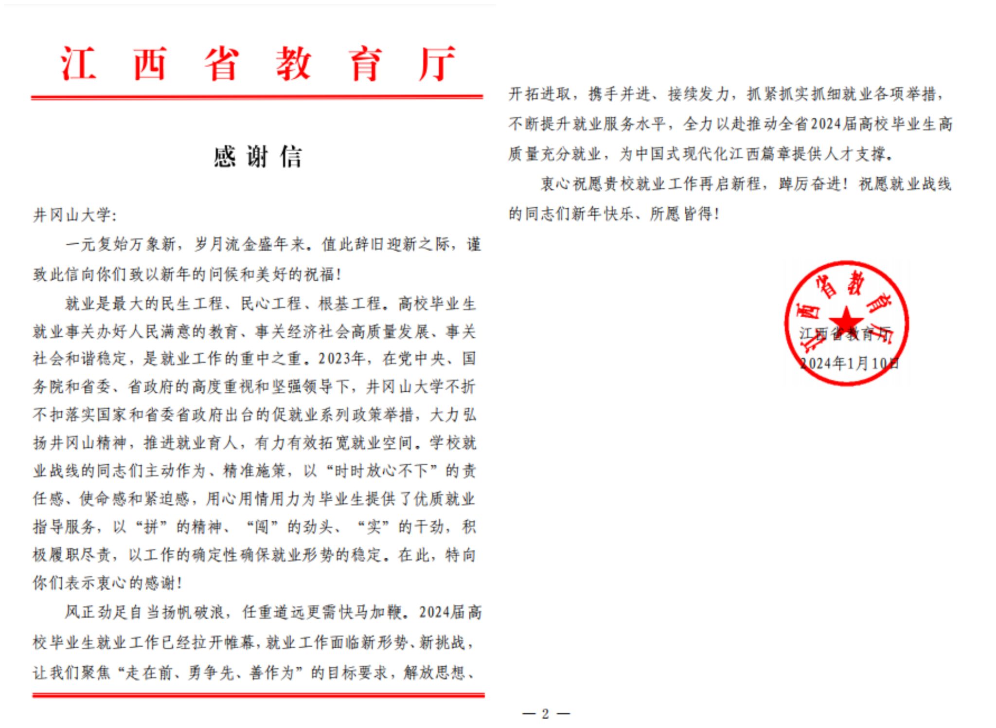 近日,江西省教育厅向井冈山大学发来一封感谢信,对学校积极推动毕业生实现高质量充分就业而作出的贡献表示肯定,对全校就业战线的同志们表示衷心感谢!