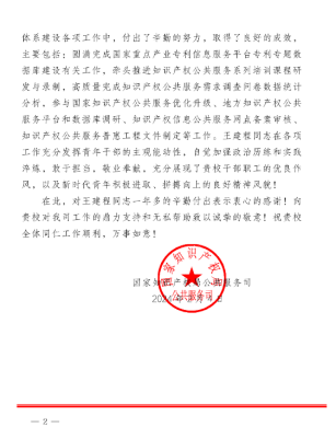 近日,国家知识产权局公共服务司向学校发来感谢信,对学校在知识产权信息服务工作中所取得的良好成效和王建程老师2023年在国家知识产权局公共服务司跟班学习期间的出色表现给予高度肯定,向学校对公共服务司工作的支持表示感谢。