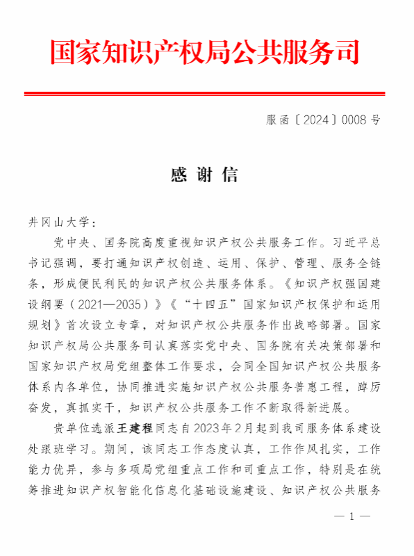 感谢信表示,党中央、国务院高度重视知识产权公共服务工作。习近平总书记强调要打通知识产权全链条,形成便民利民的服务体系。井冈山大学积极响应国家号召,选派得力教师赴国家知识产权局服务体系建设处跟班学习,在统筹推进知识产权智能化信息化基础设施建设、知识产权公共服务体系建设等重点工作中取得了良好成绩,展现出井冈山大学青年干部职工积极进取、拼搏向上的良好精神风貌。
