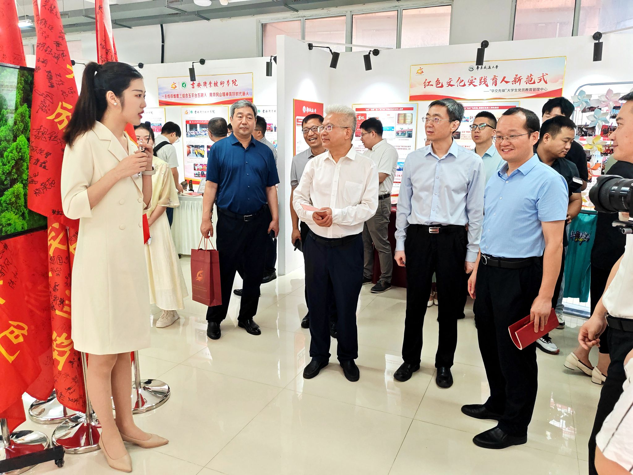 6月28日,由江西省委教育工委、省教育厅主办的全国红色文化育人共同体成立仪式暨第四届江西高校大学生红色文化论坛优秀作品展在江西科技师范大学举行。我校“知情体悟行”五位一体红色励志实践育人的十年探索”获评全省高校2024年红色文化实践“十佳案例”并进行了现场展示,红色励志教育培训班获2023年全省高校“红色班级”创建试点并在大会上通报表彰,江西省委教育工委委员、省教育厅副厅长汪立夏等一行到我校展位参观指导并对我校红色文化育人工作给予充分肯定,省内外兄弟院校驻足我校展位,就红色文化育人工作开展情况与我校进行交流研讨,校党委常委、副校长敖四江参加论坛活动并来到我校展位现场指导。